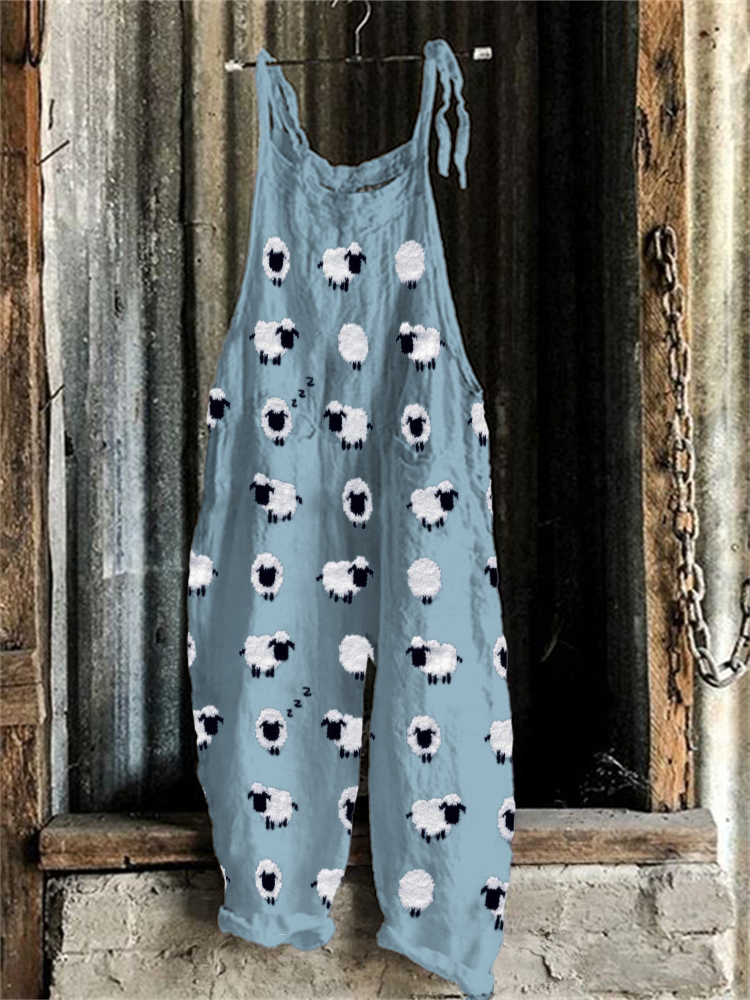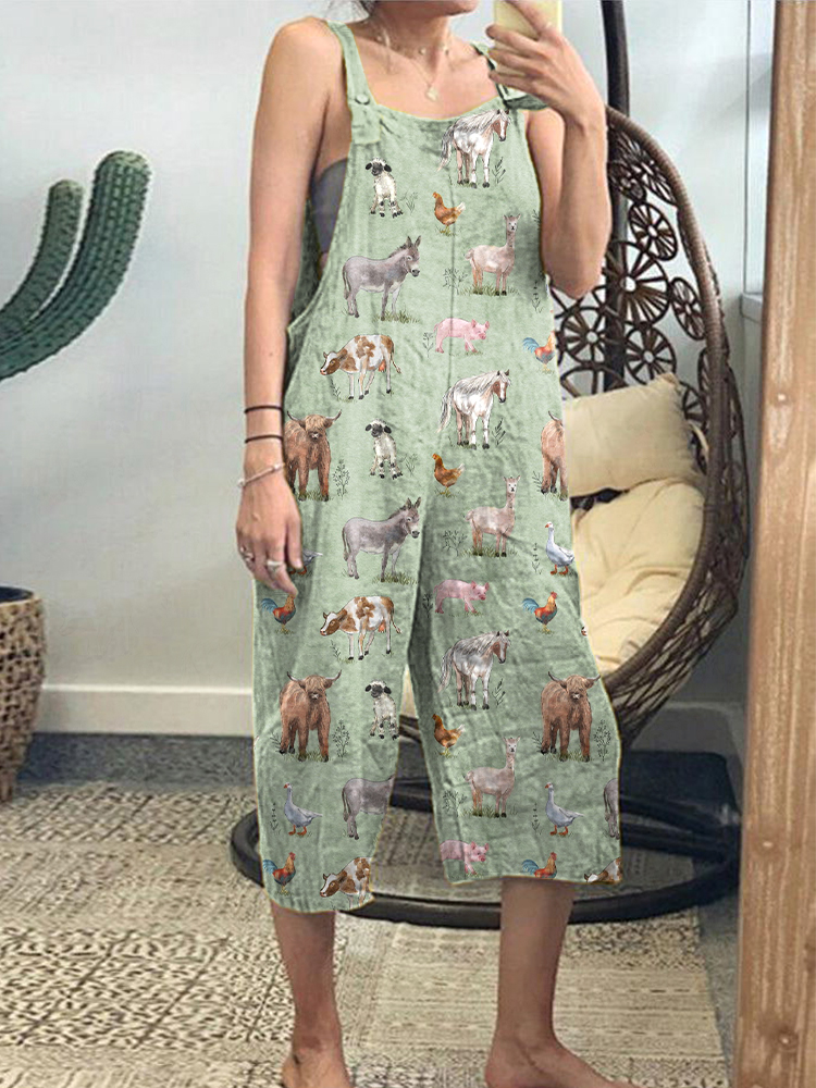 Farm Animals Print Cotton Linen Casual Jumpsuit