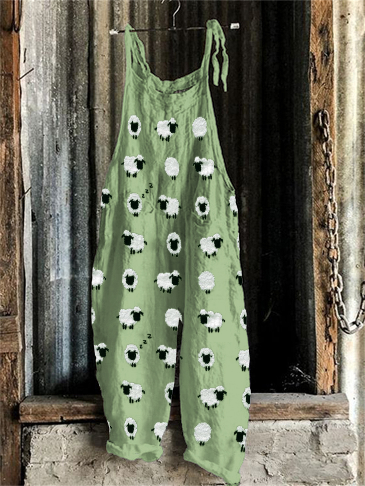 Sheep Grassland Landscape Art Loose Fit Jumpsuit
