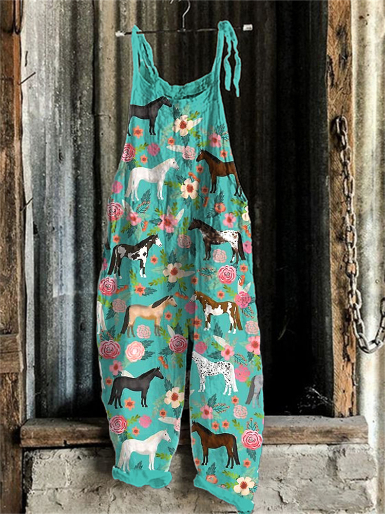 Western Horse & Floral Print Linen Blend Casual Jumpsuit