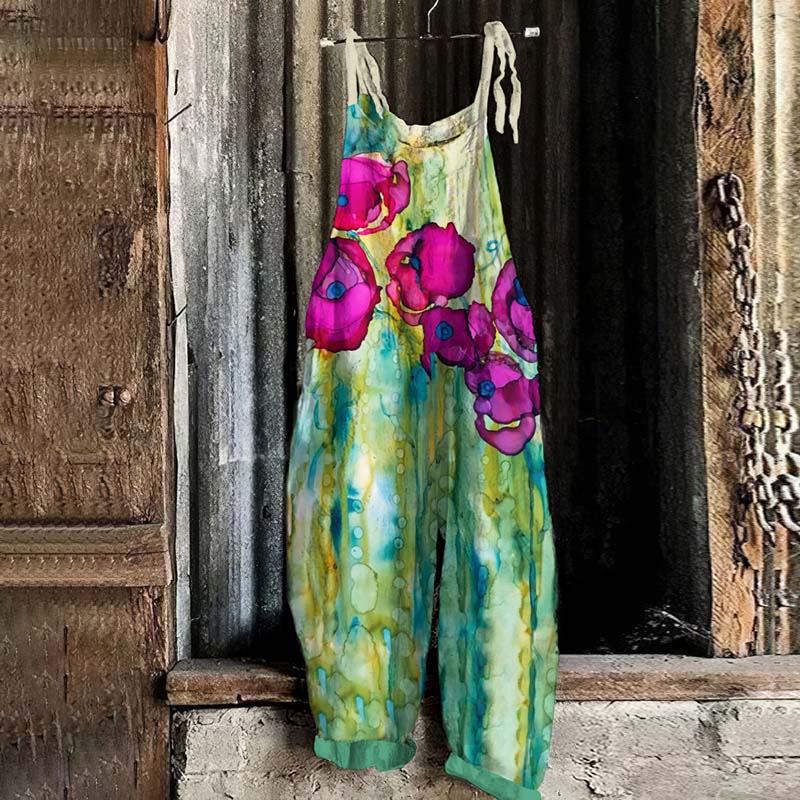 Vintage Colourful Flowers Oil Painting Art Graphic Casual Loose Jumpsuit