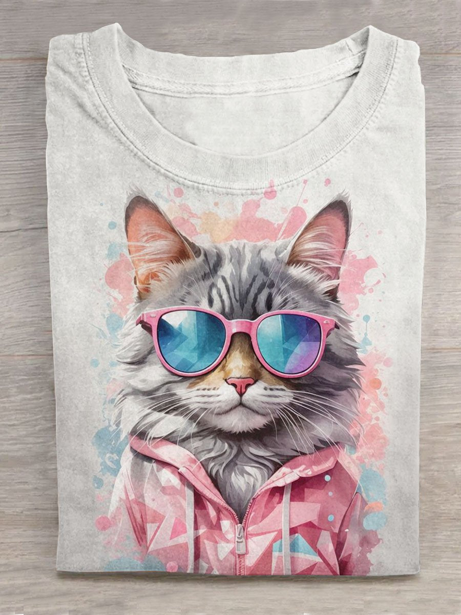 Retro Fun Cat Art Print Casual Pure Cotton Short Sleeved T-shirt