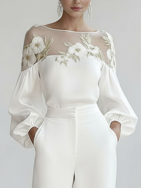 Applique Flower Shape Mesh Split-Joint Loose Puff Sleeves Round-neck Blouses&shirts Tops