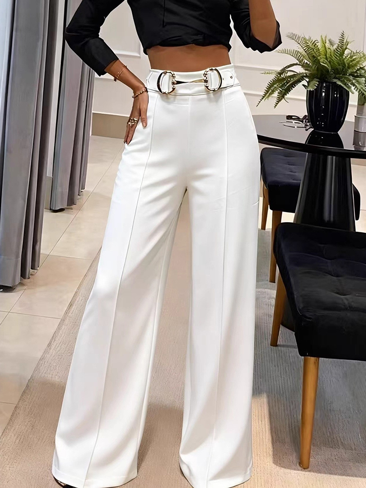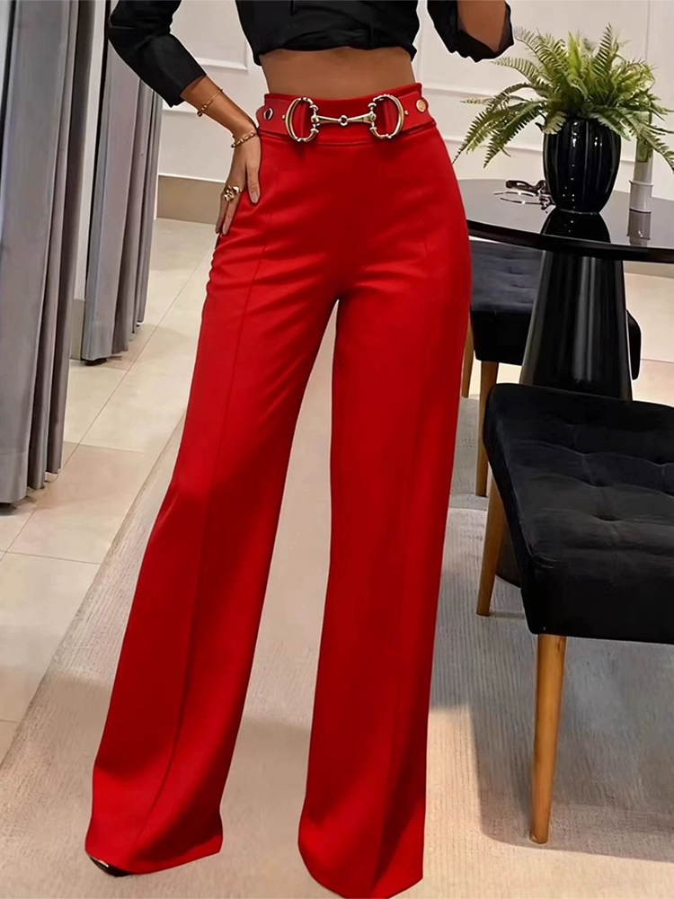 Fashion Solid Color Pocket Commute Trouser Hot Girl Slim Straight Long Pants New High Waist Metal Buckle Decoration Pants