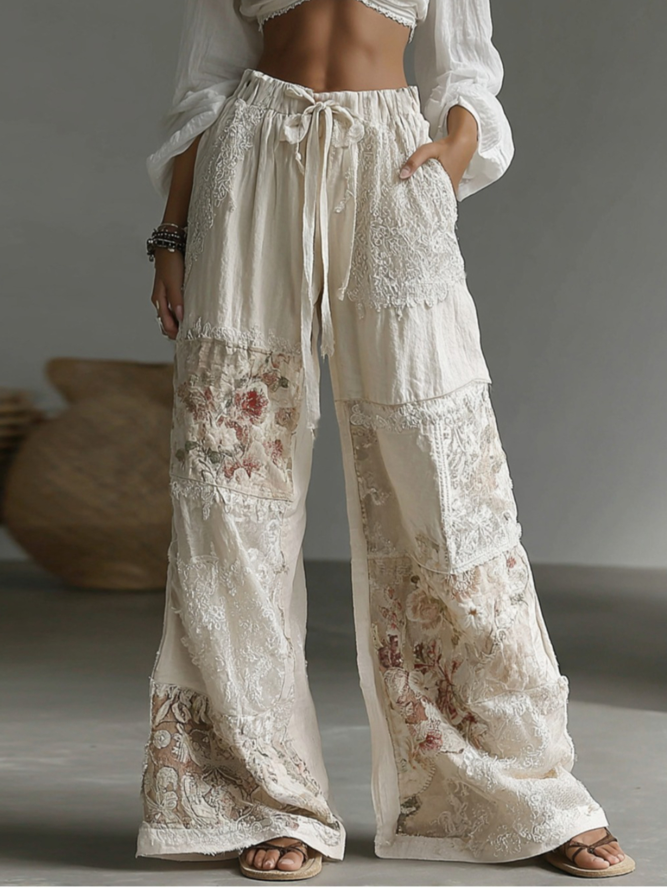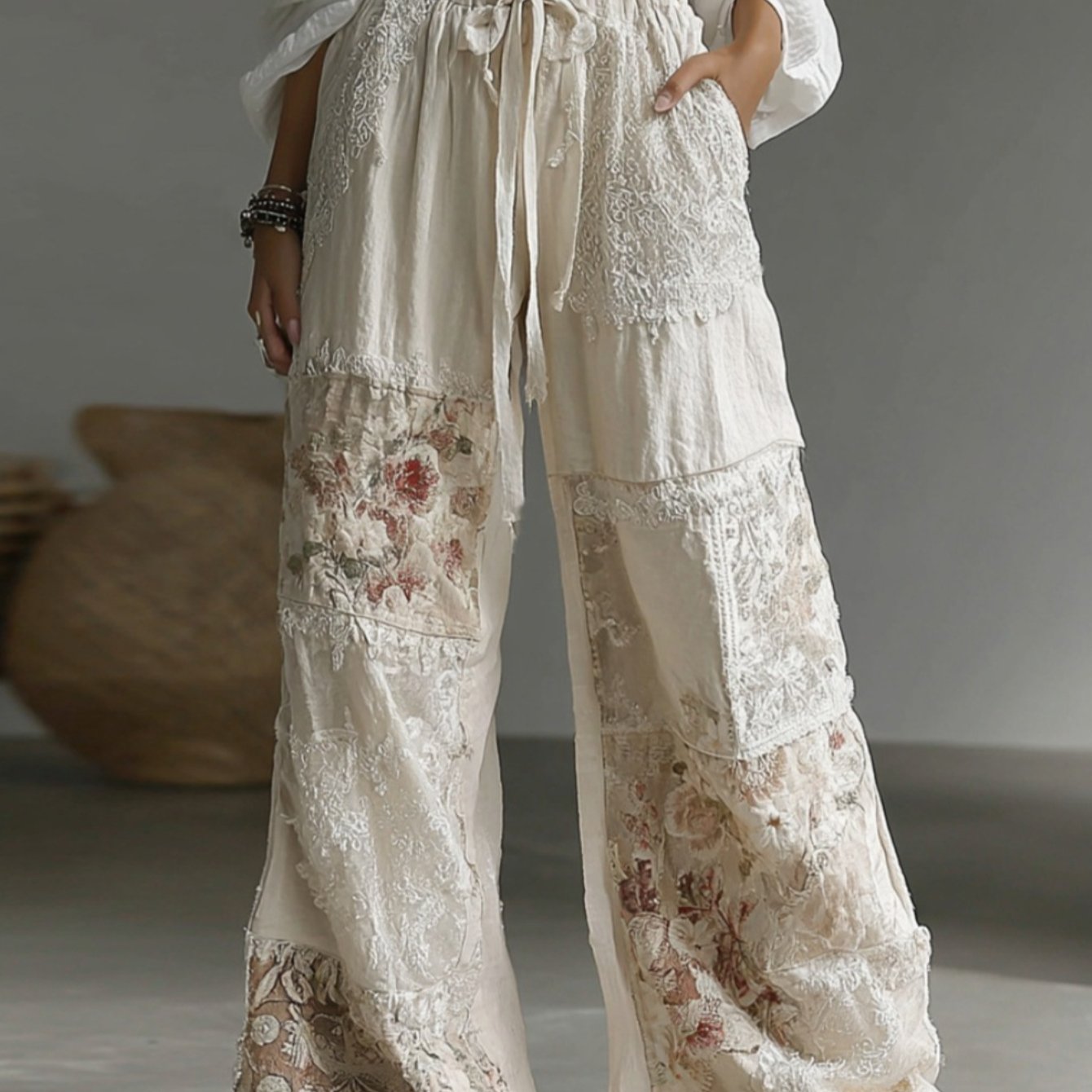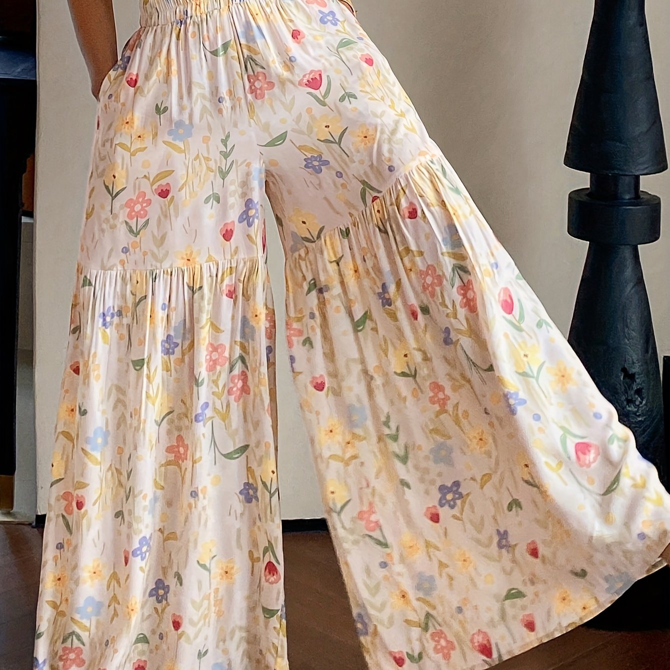 🌸Women’s Boho Floral Wide-Leg Trousers | Drawstring Color-Blocked Loose Wedding Holiday Casual Pants