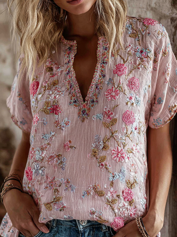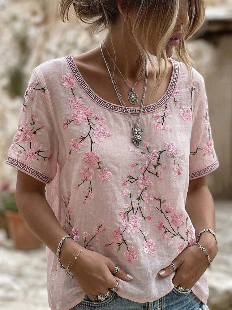 Retro Colorful Floral Embroidery Art Blend Washed Cotton Linen Short Sleeve Top