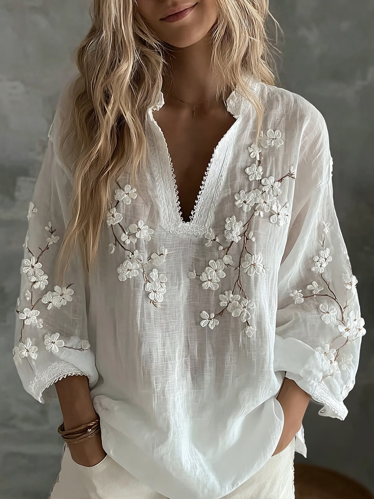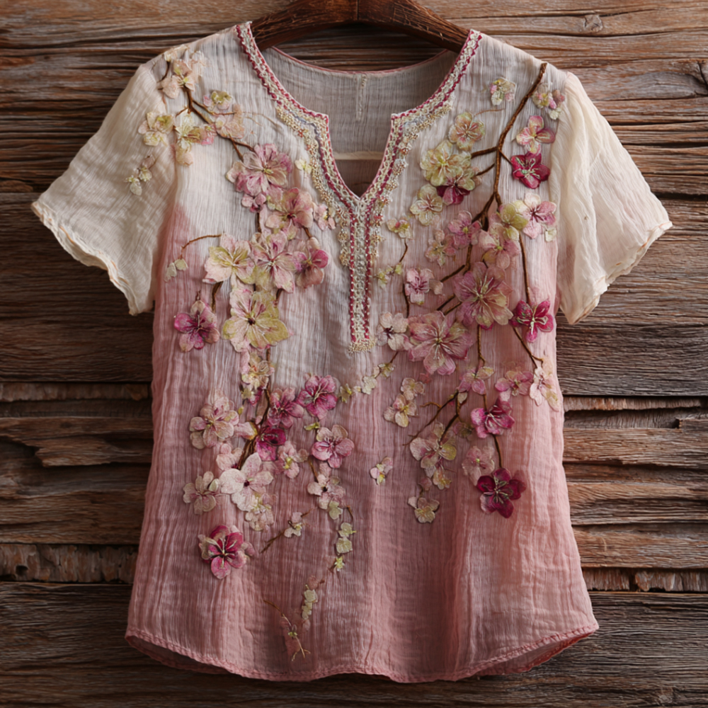 Vintage Cherry Blossom Embroidery Artistic Gradient Cotton Linen Casual V-neck Top