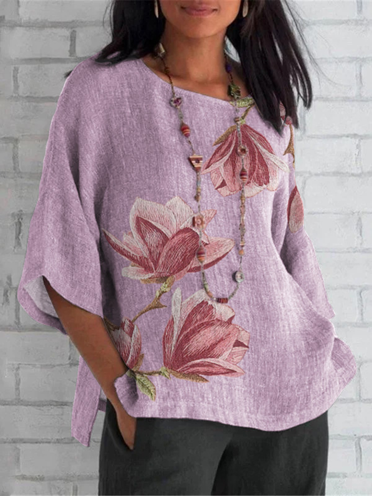 Retro Floral Embroidery Art Linen Blend Cozy Tunic