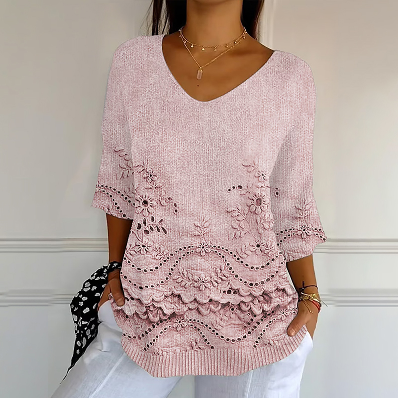 Vintage Cherry Blossom Embroidery Patchwork Lace V-neck Linen T-shirt