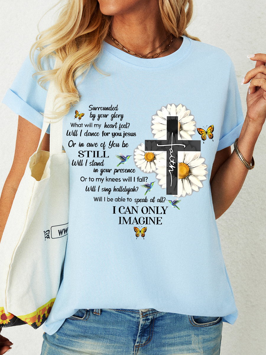 Women's Mercyme I Can Only Imagine Daisy Cross Christian Daisy Text Letters Simple Loose T-Shirt
