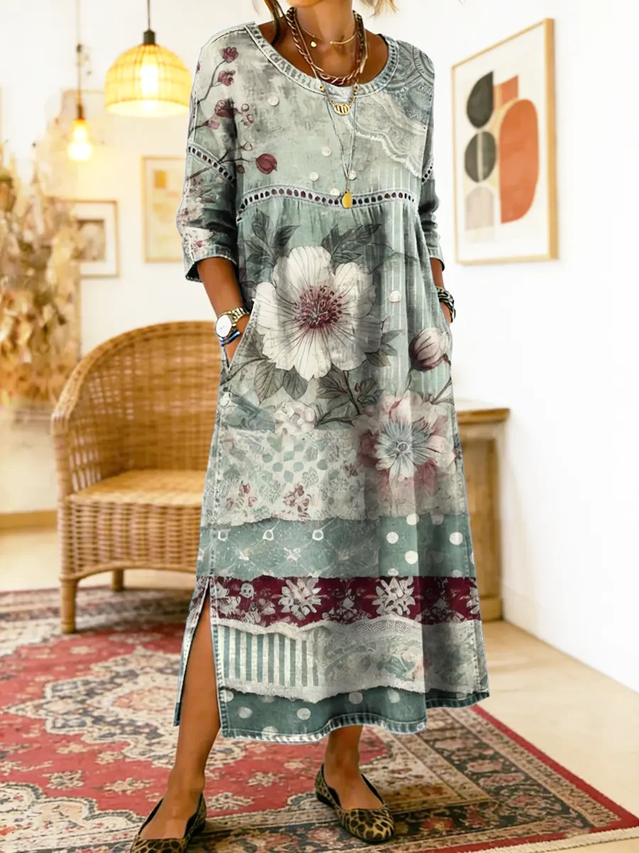 Women's Bohemian Floral Art Print Round Neck Hollow-out Denim Dress