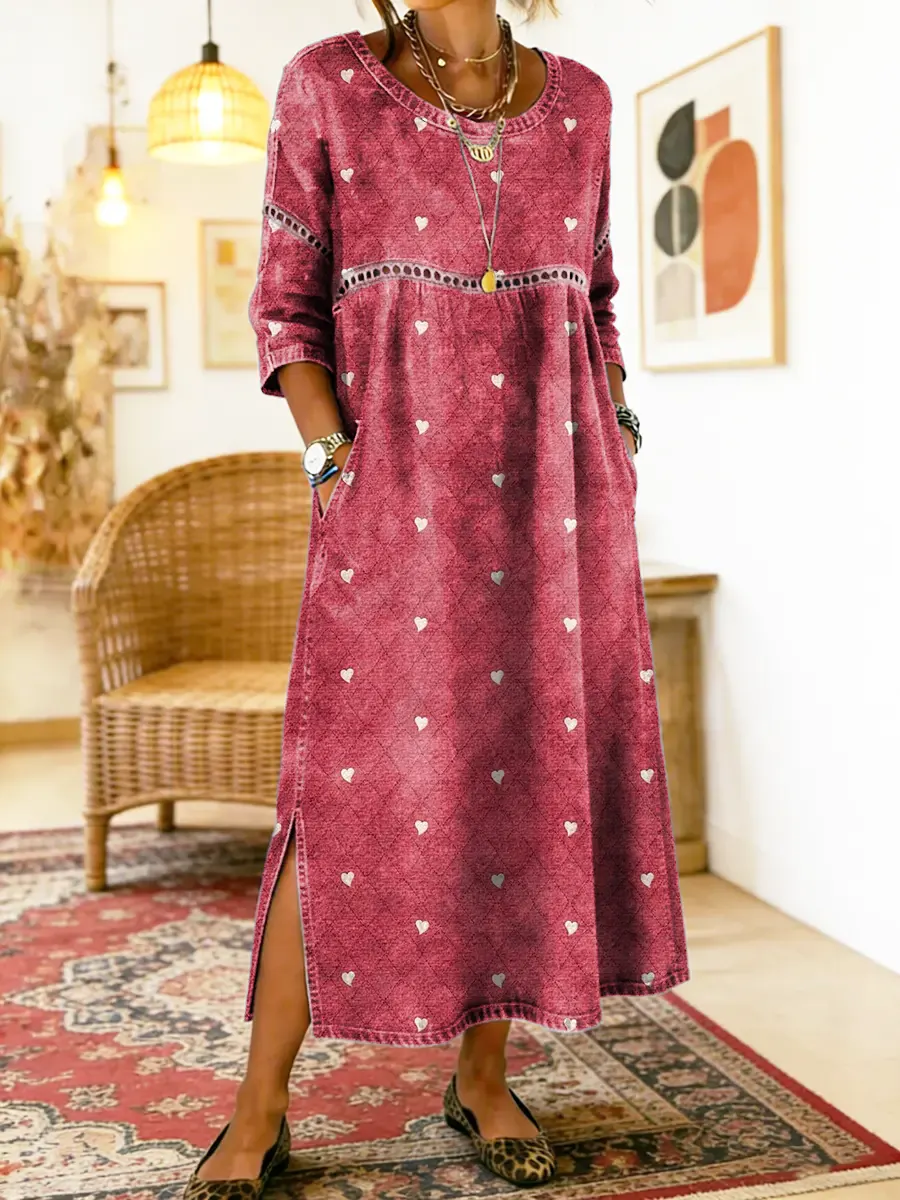 Women's Bohemian-style Floral Heart Art Print Cotton Denim Dress With Lace Trim