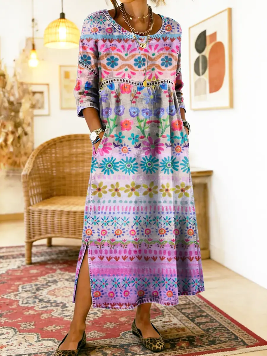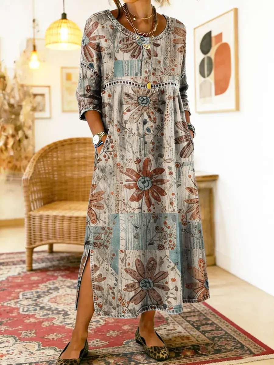 Women's Retro Ethnic Floral Art Print Casual Round Neck Hollow-out Washed Cotton Denim Dress