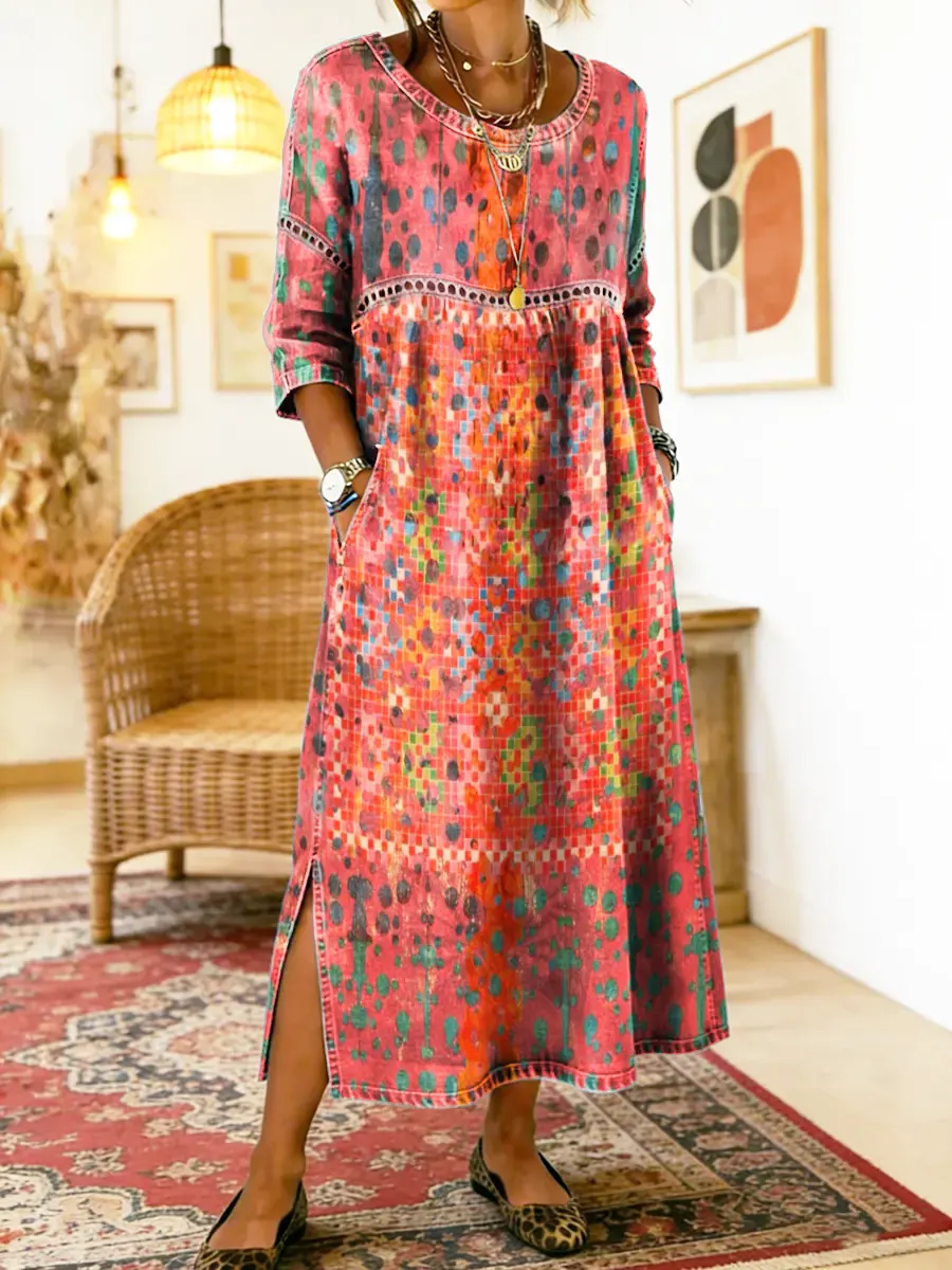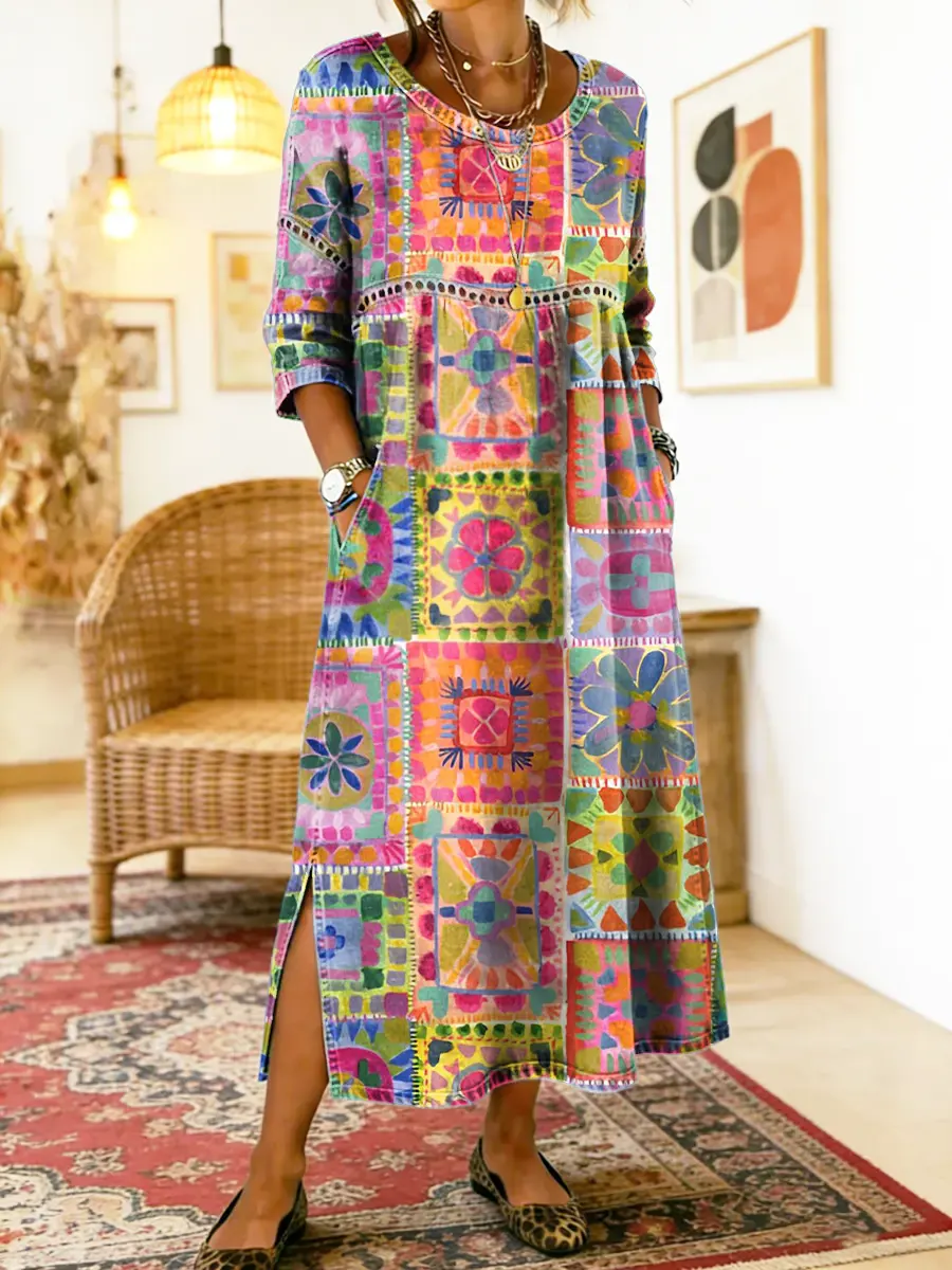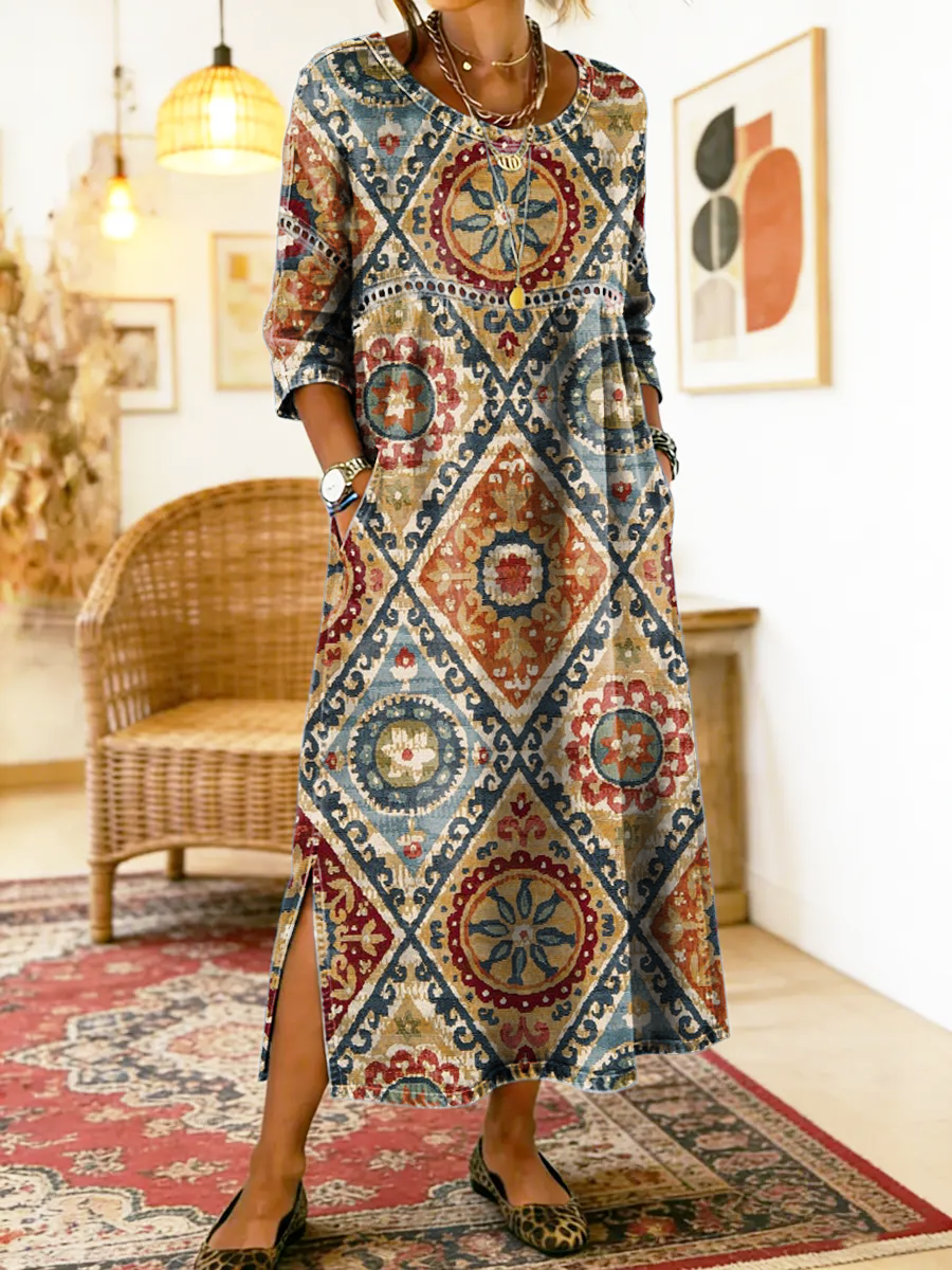 Women's Retro Ethnic Plaid Art Print Casual Round Neck Hollow-out Washed Cotton Denim Dress