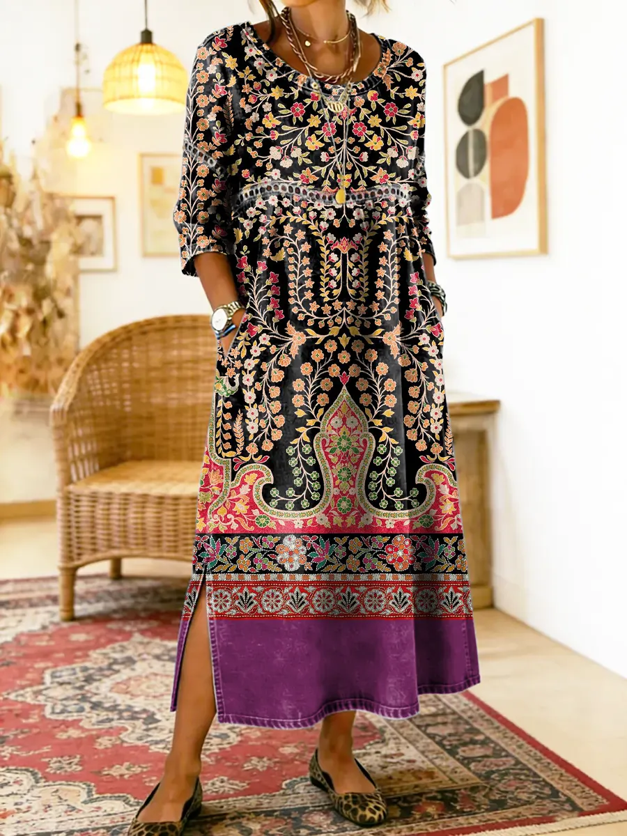 Women's Vintage Ethnic Floral Totem Art Print Patchwork Cotton Denim Dress