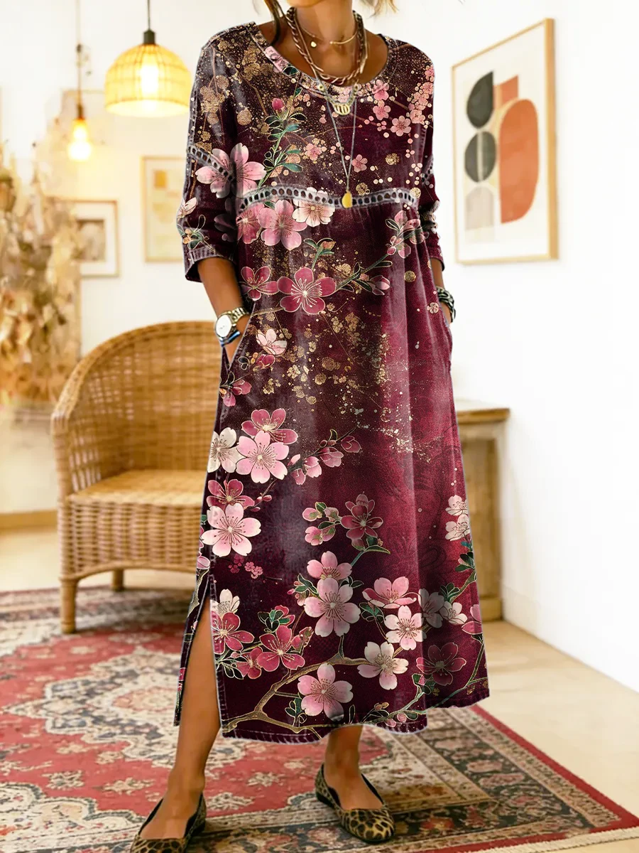 Women's Vintage Ethnic Purple Floral Art Print Patchwork Cotton Denim Dress