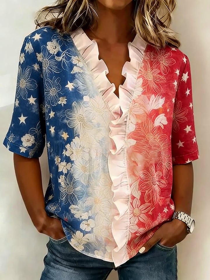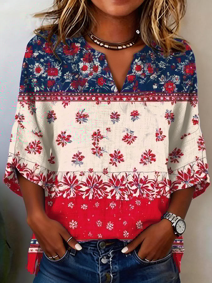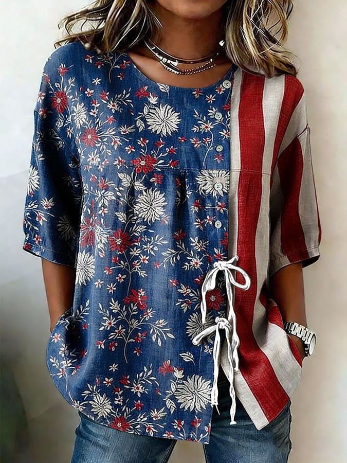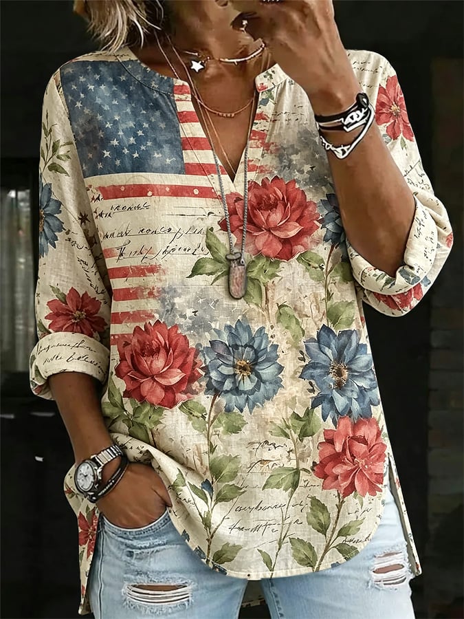 Women's Retro Flag and Floral Print Casual Shirt