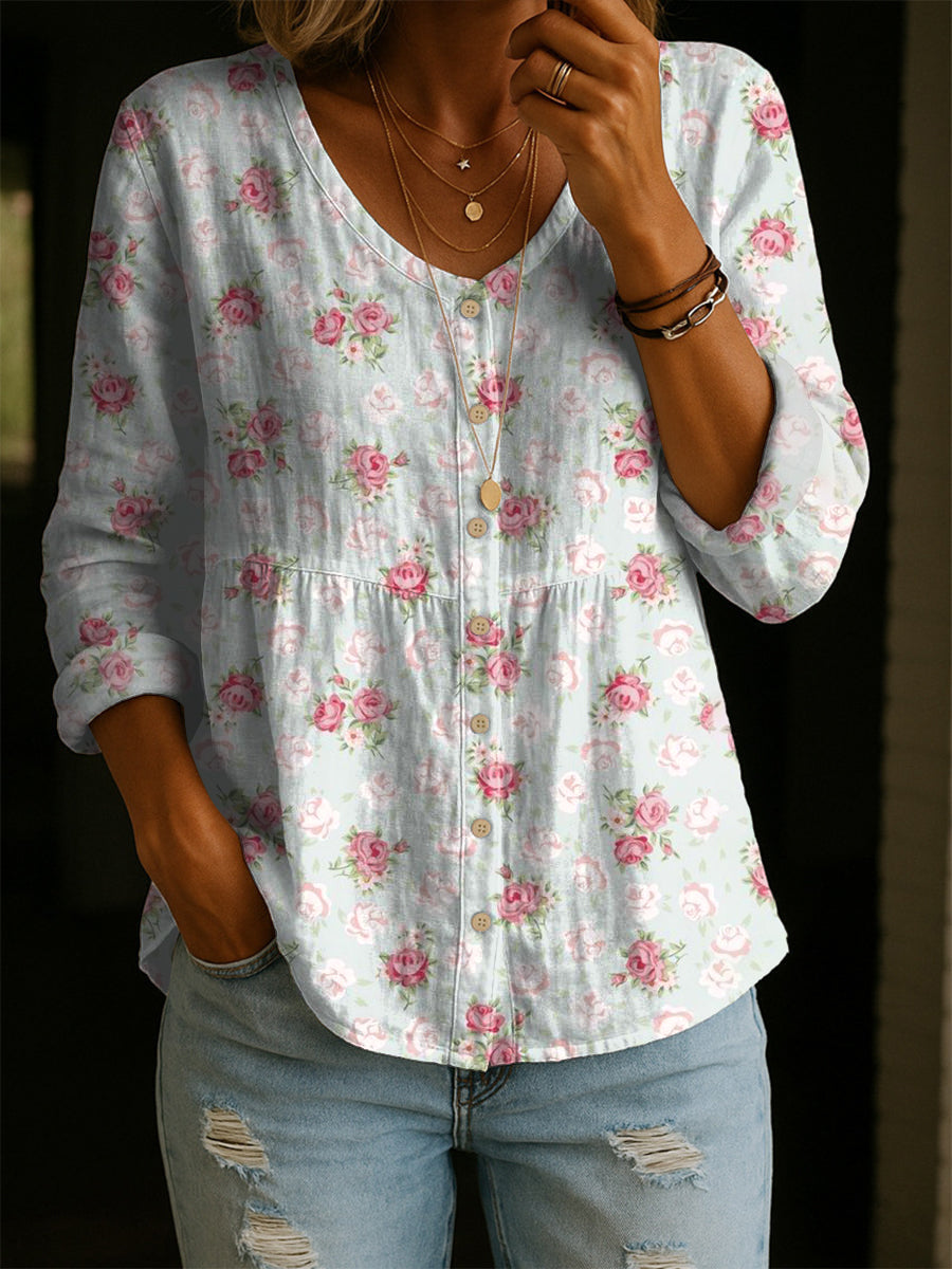 Women's Vintage Rose Flower Art Print Linen Cotton Shirt