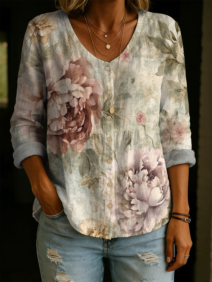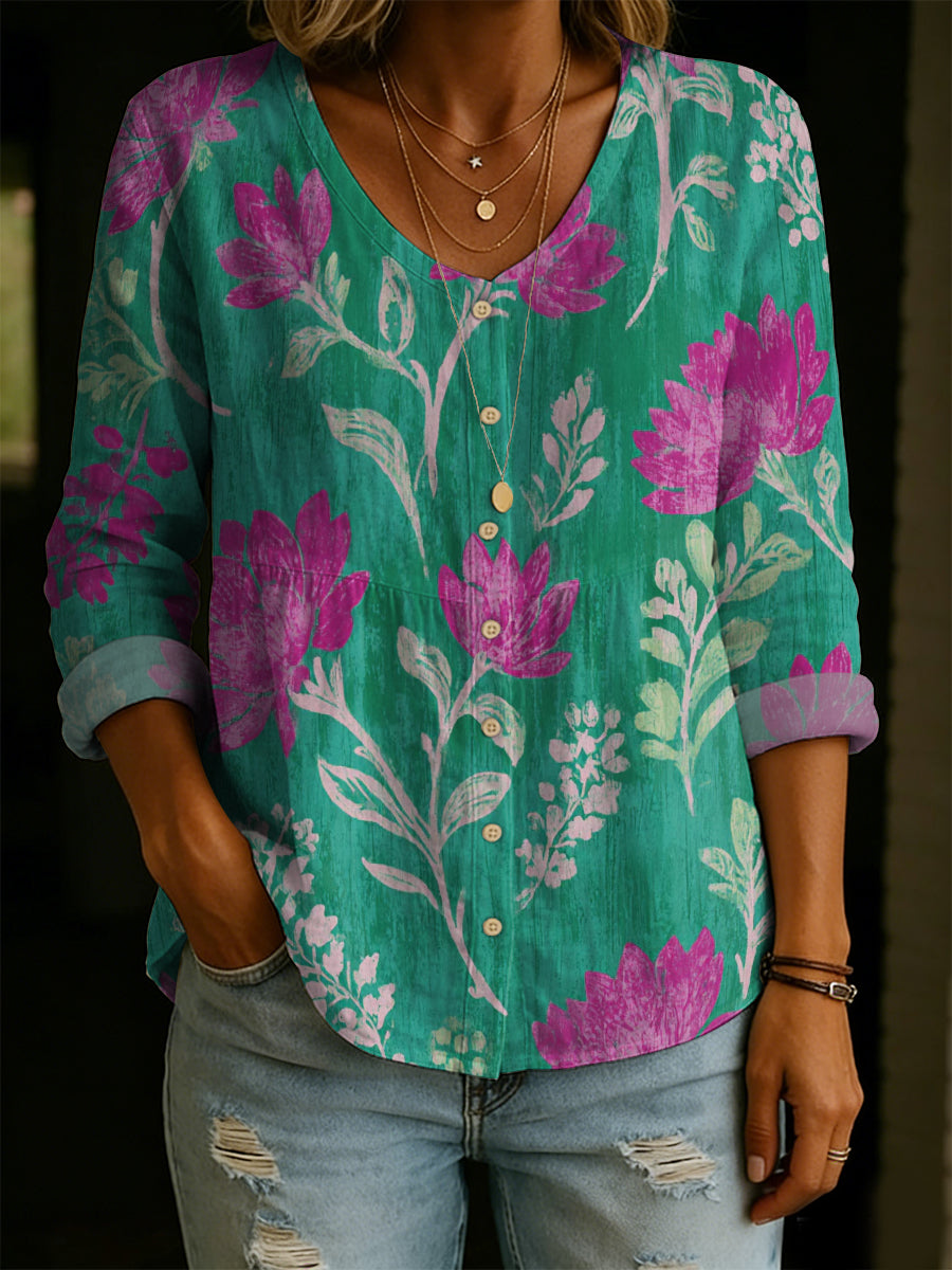 Women's Vintage Flower Art Print Linen Cotton Shirt