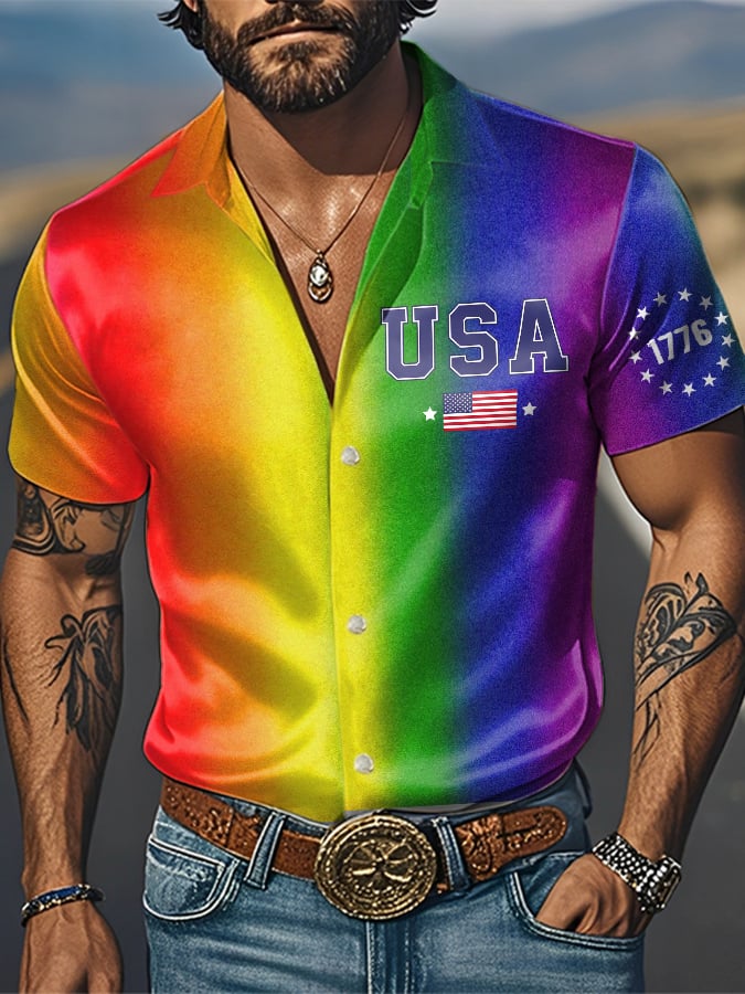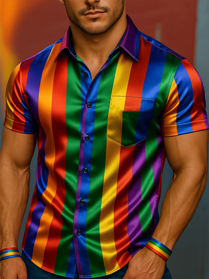 Men's Fashion Casual Rainbow Satin Gay Independence Day Shirt