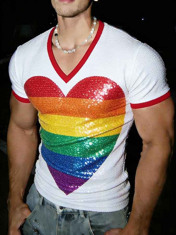 Men's V-Neck Slim-Fit Pride Month Rainbow Print T-Shirt
