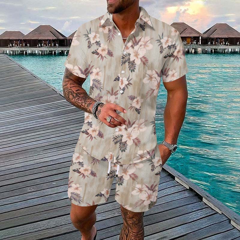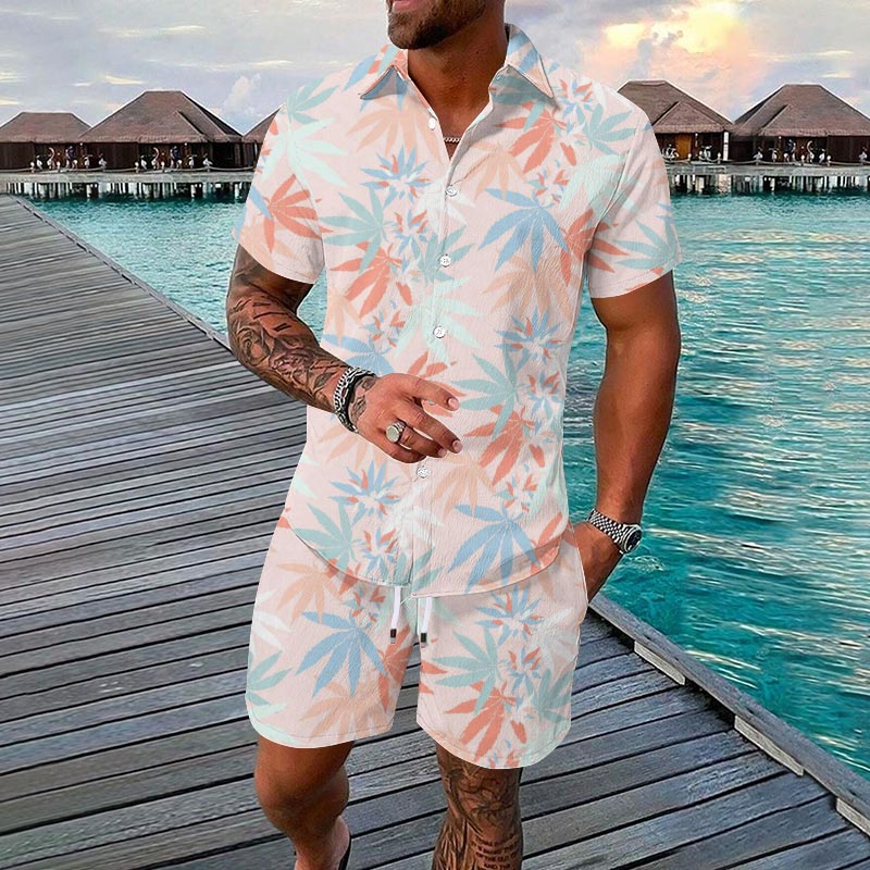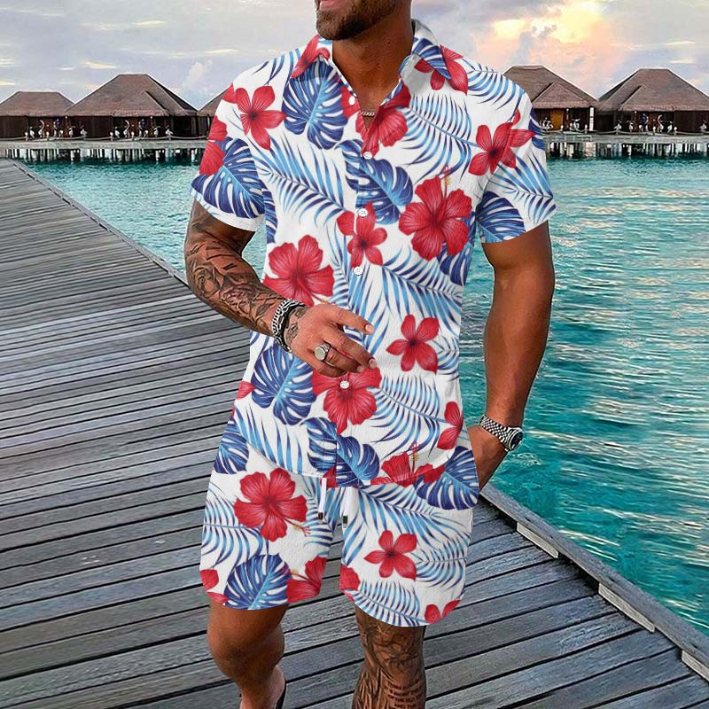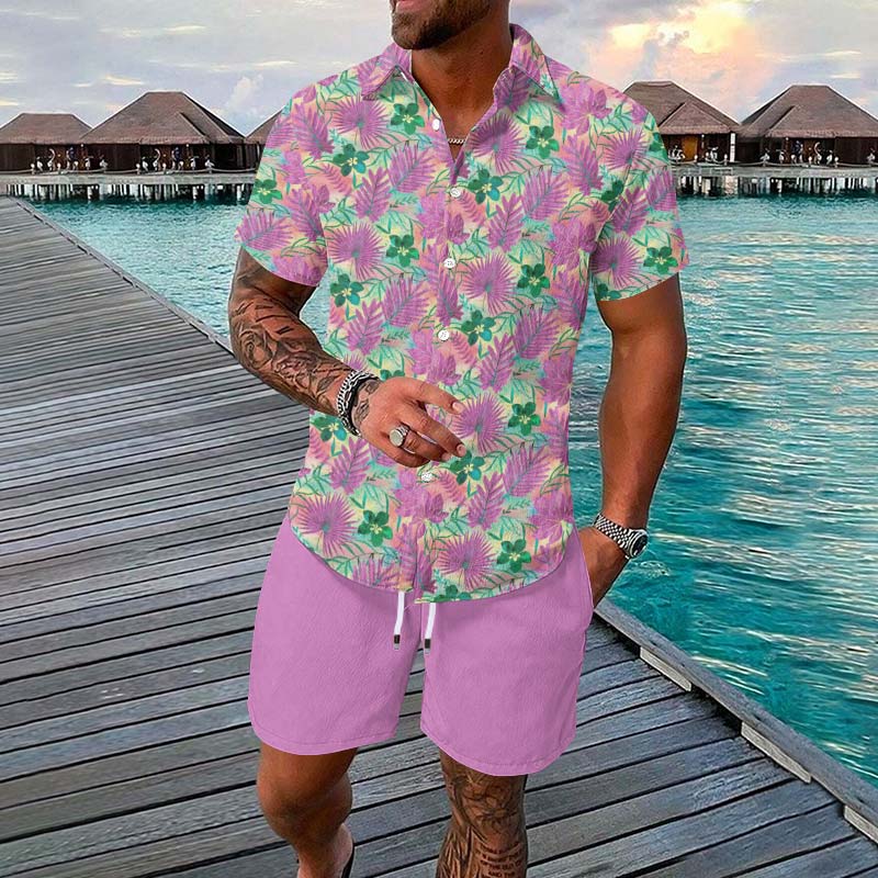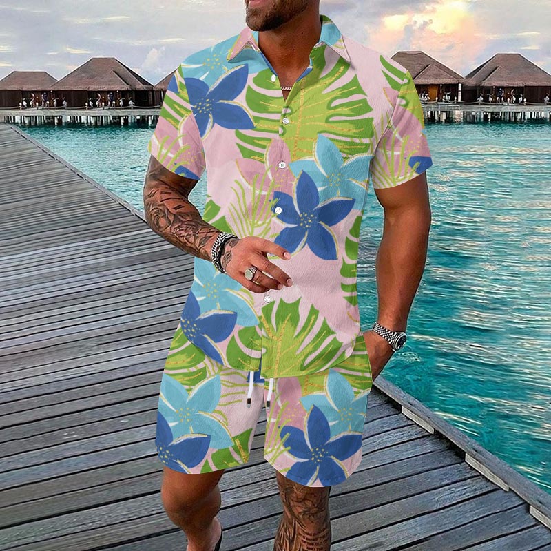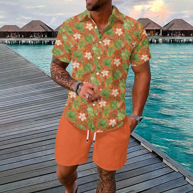 Summer Men's Vacation Tropical Botanical Print Short-sleeve Hawaiian Shirt Set