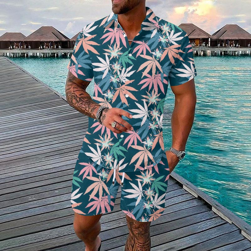 Summer Vacation Men's Tropical Leaf Print Short-sleeve Shirt Set