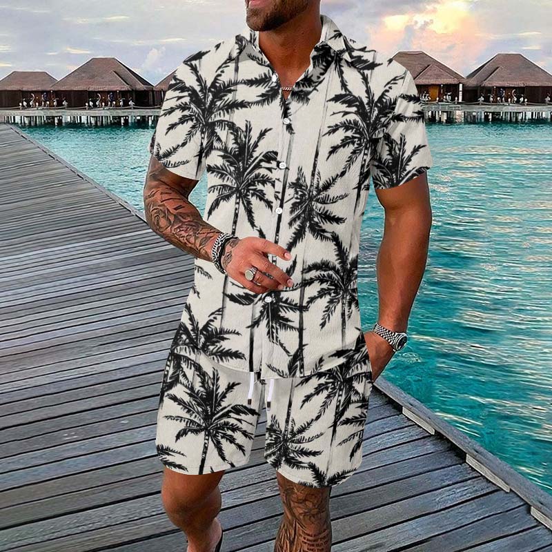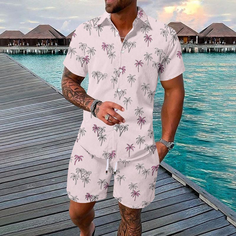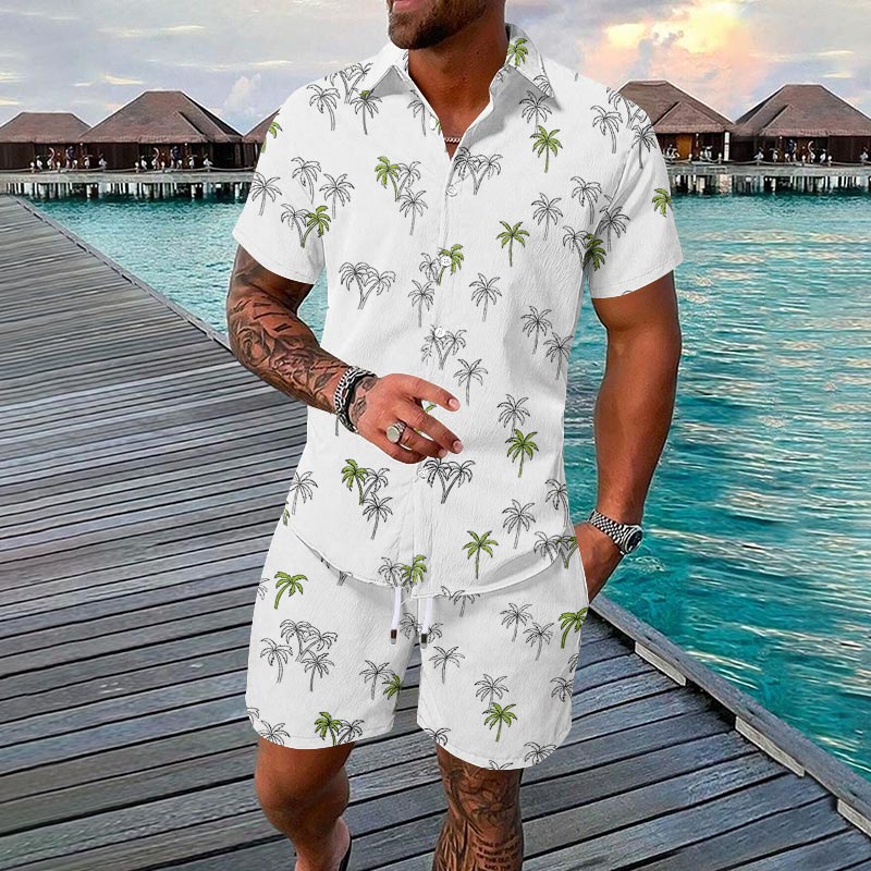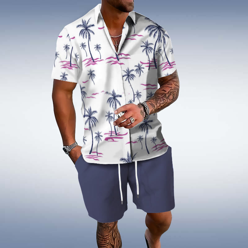 Men's Vacation Simple Palm Tree Print Short-sleeve Hawaiian Shirt Set