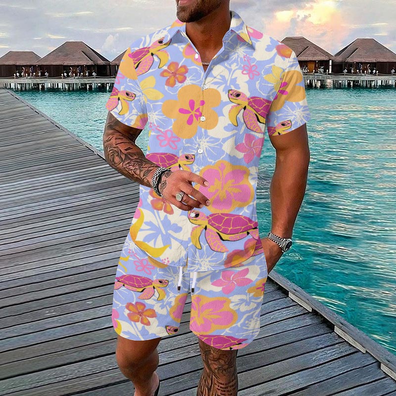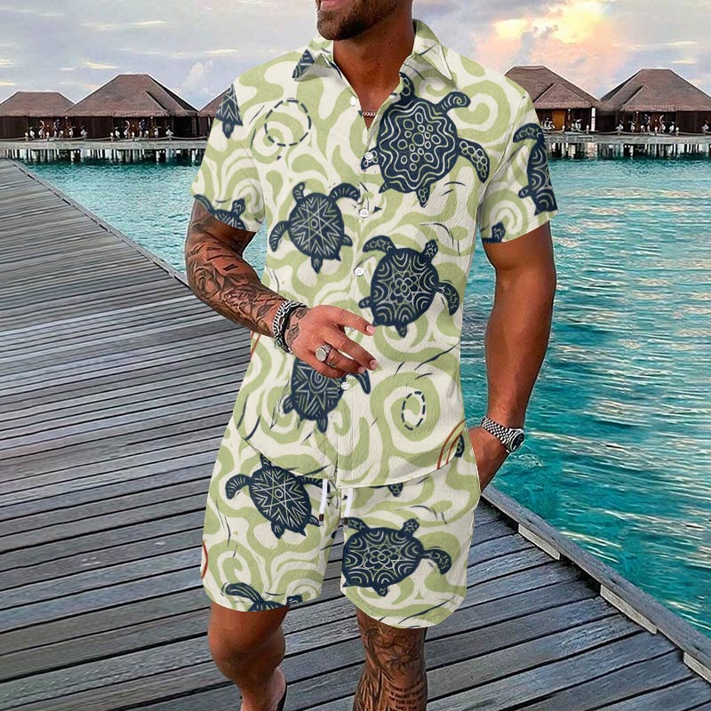 Men's Holiday Casual Simple Ethnic Style Turtle Print Short-sleeve Hawaiian Shirt Set