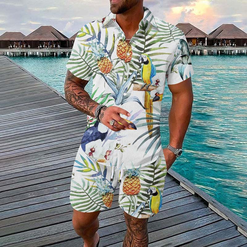 Summer Beach Vacation Men's Tropical Pineapple Parrot Print Short-sleeve Shirt Set