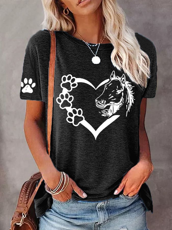 🐴Women's Dogs And Horses Love Heart Dog Lover Casual O-Neck Tee