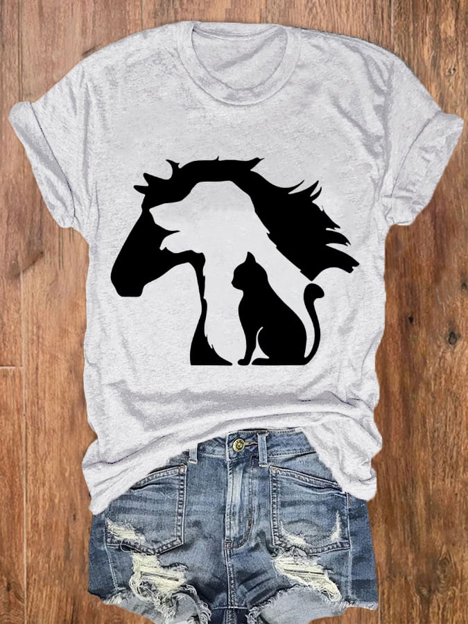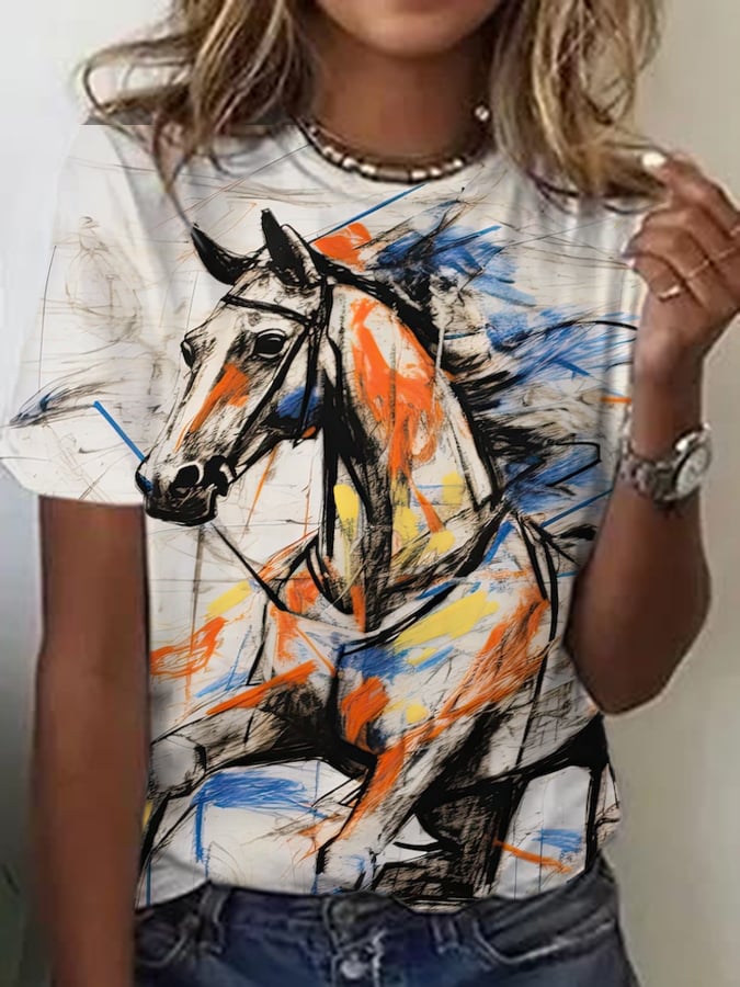 Women's Animal Horse Printed Round Neck Short Sleeve T-Shirt