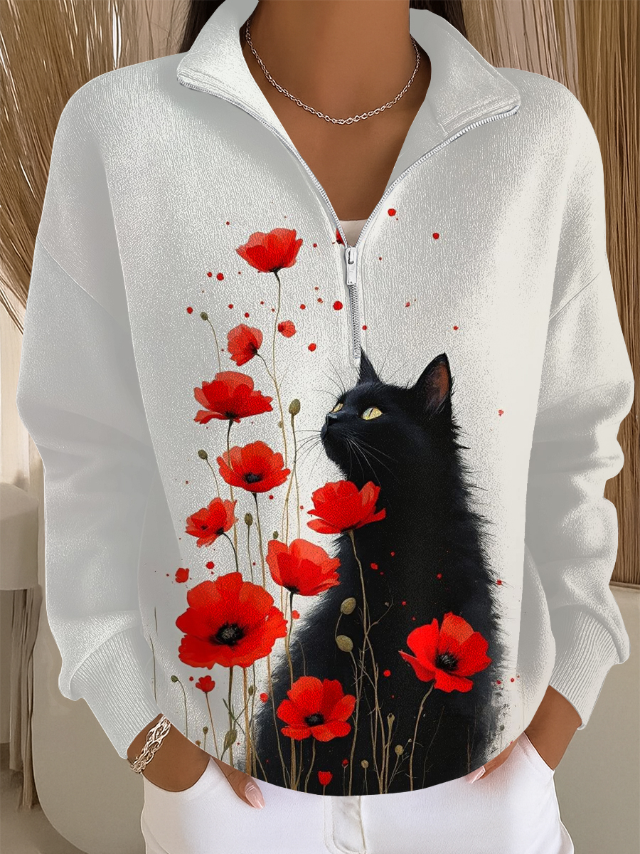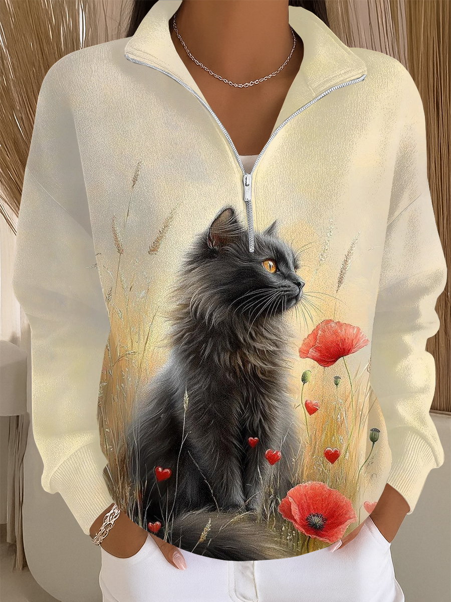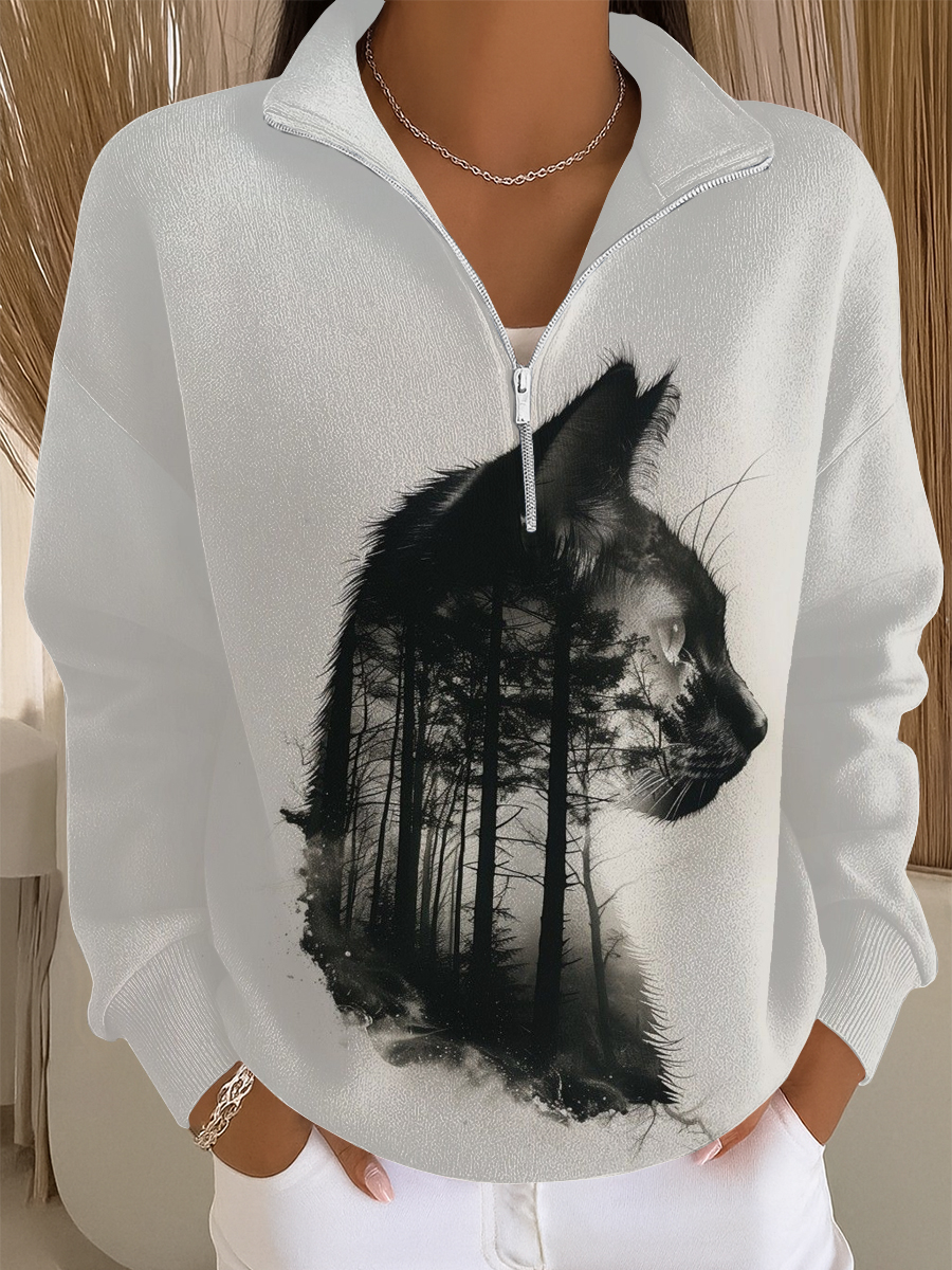 Women's Casual Cat Print Textured Sweatshirt Jacket