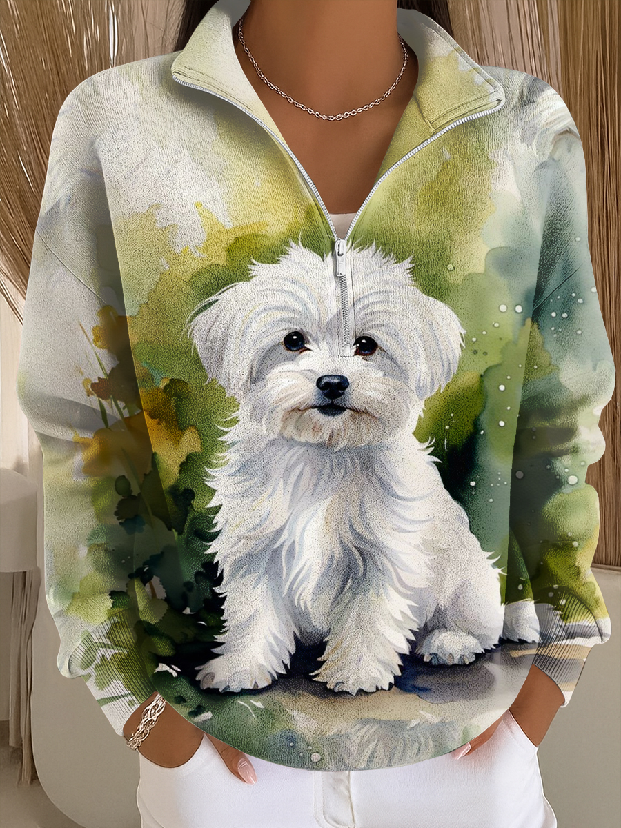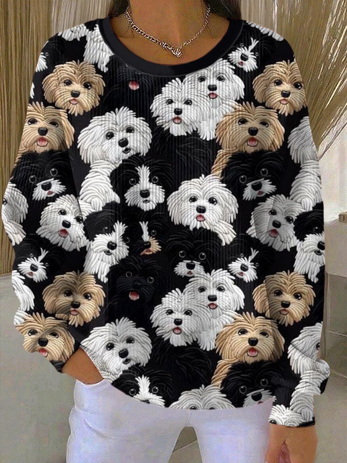 Women's Dog Print Knit Crew Neck Long Sleeve Top