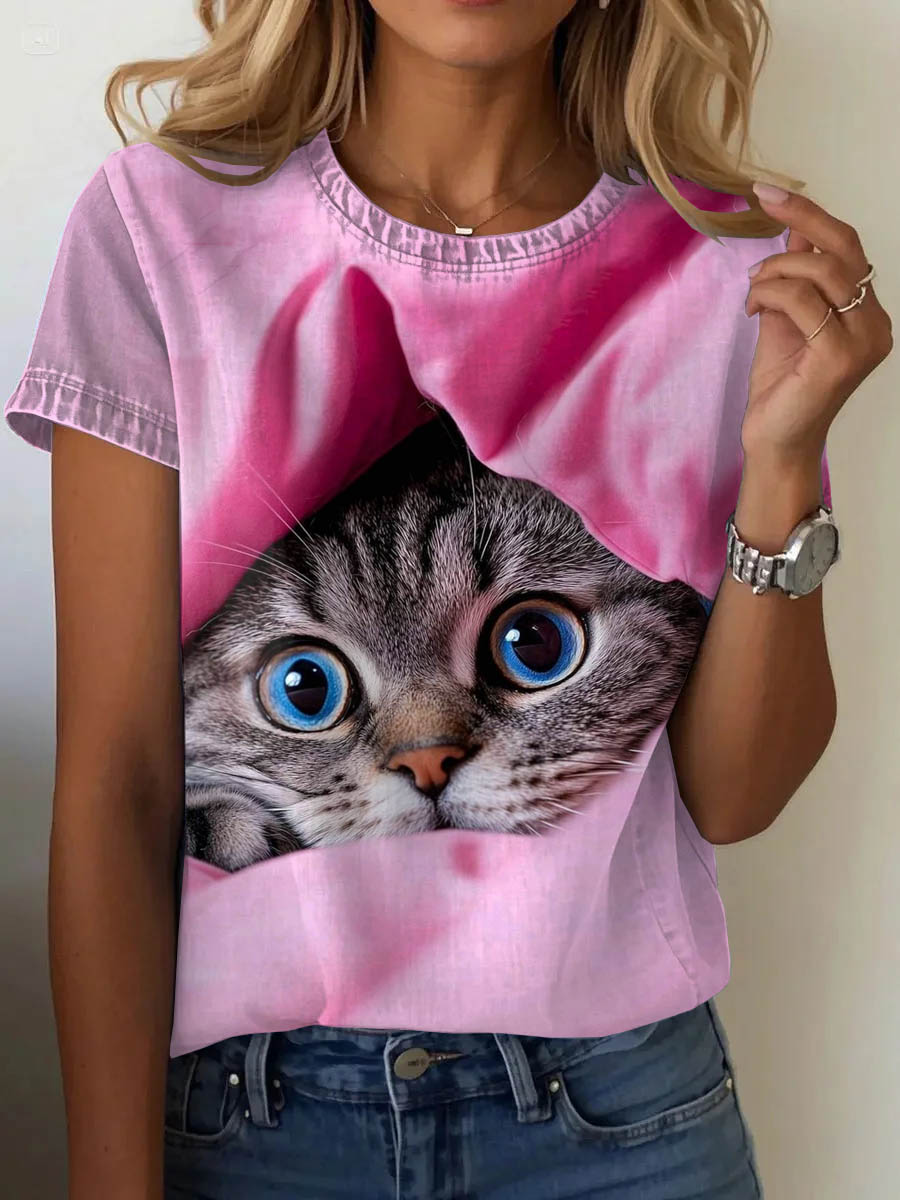 Pink October Art Cat Print Casual Short Sleeve T-Shirt