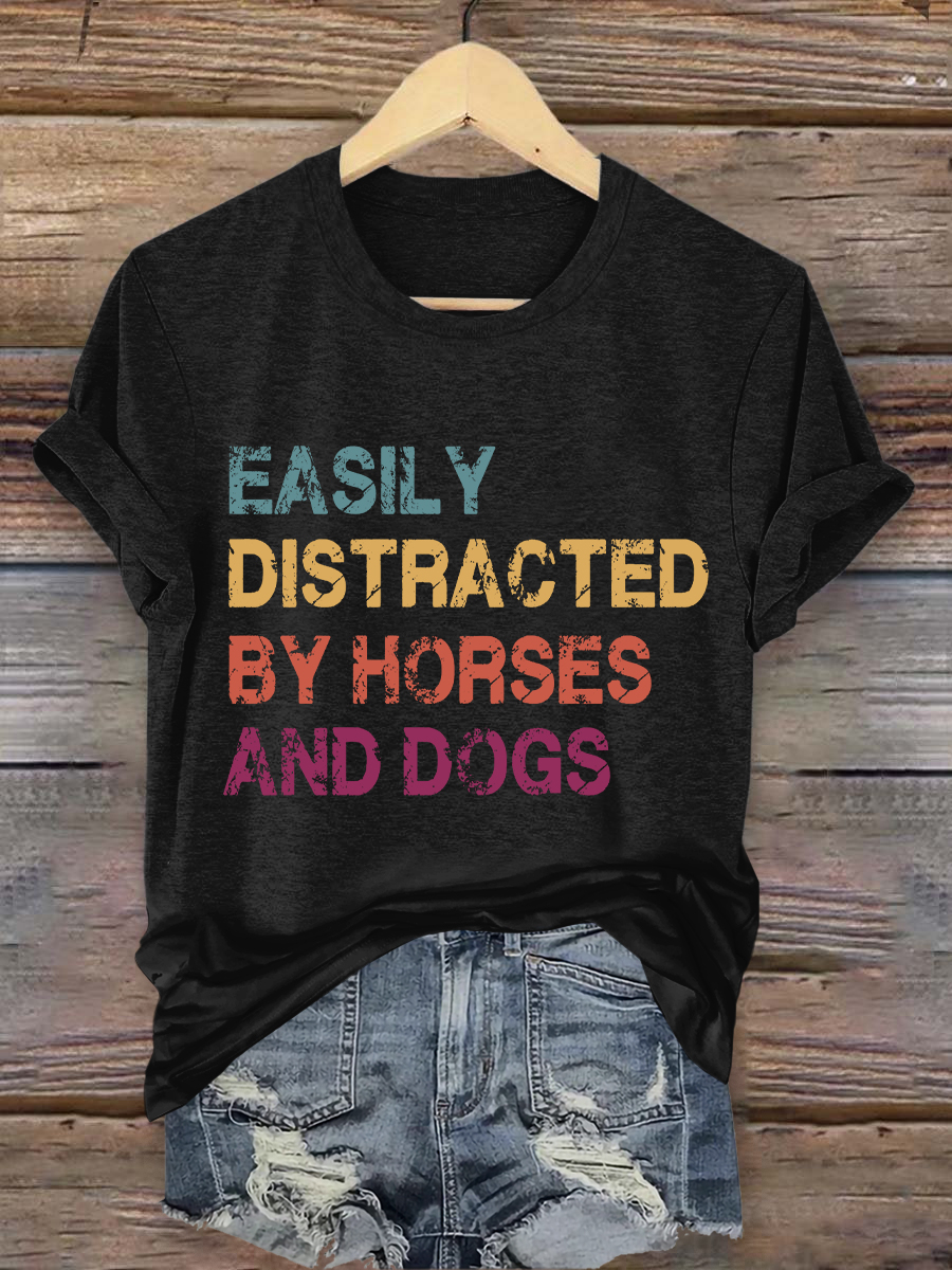Easily Distracted By Horses And Dogs Print Casual Short Sleeve T-Shirt