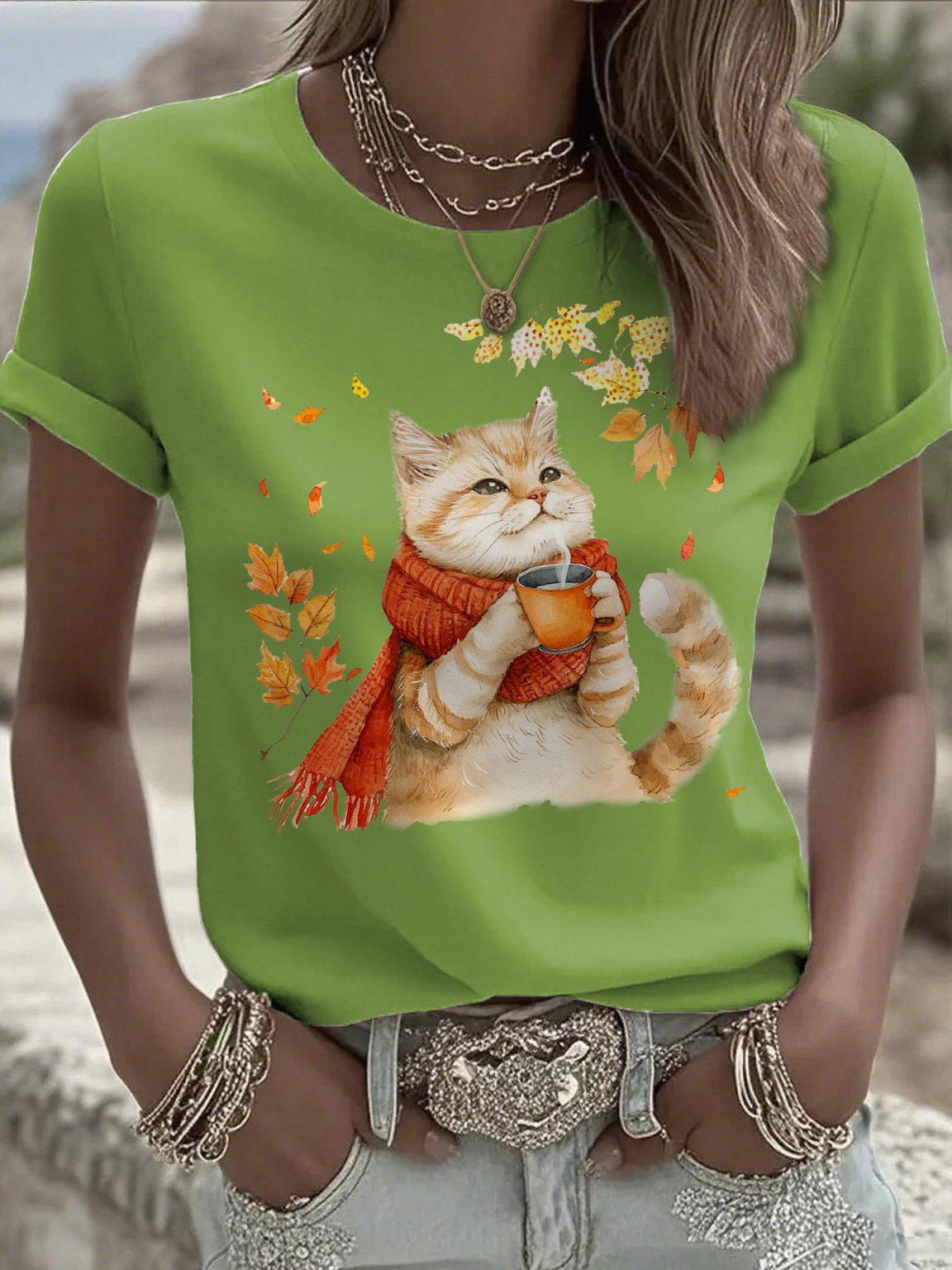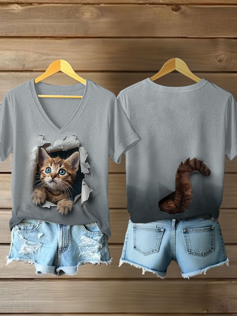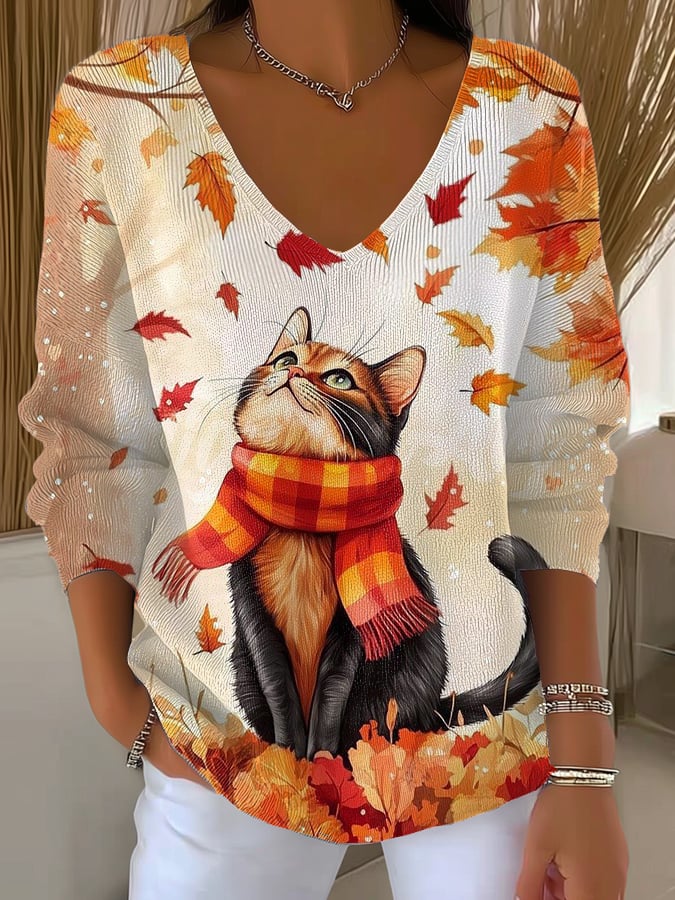 Women's Casual Autumn Animal Cat Print T-shirt