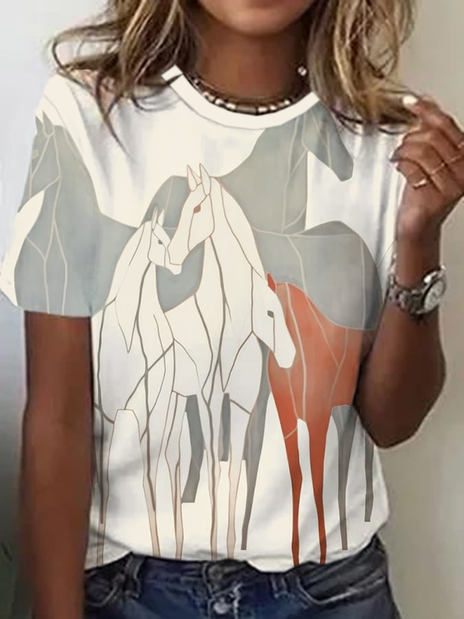 Women's Animal Horse Printed Round Neck Short Sleeve T-Shirt