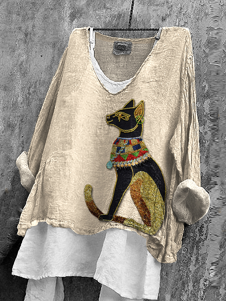 Women's Vintage Ancient Egyptian Cat Embroidered Linen Flowy Shirt