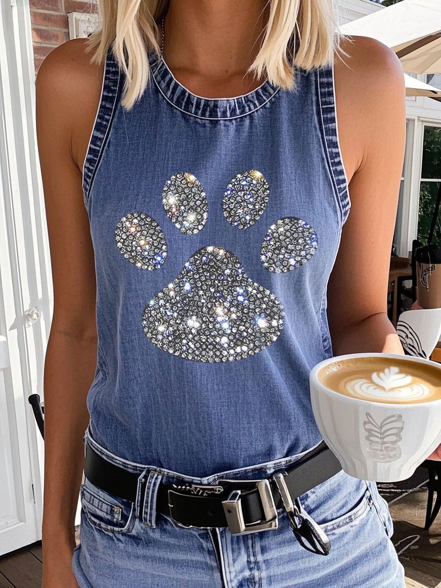 Women's Denim Rhinestone Claw Print Short Sleeve Tank Top