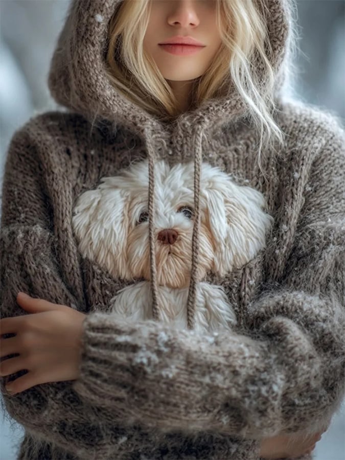 Women's Cute Fuzzy Dog Embroidered Soft Hooded Sweater
