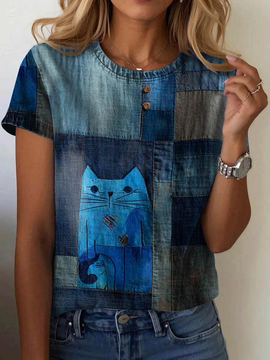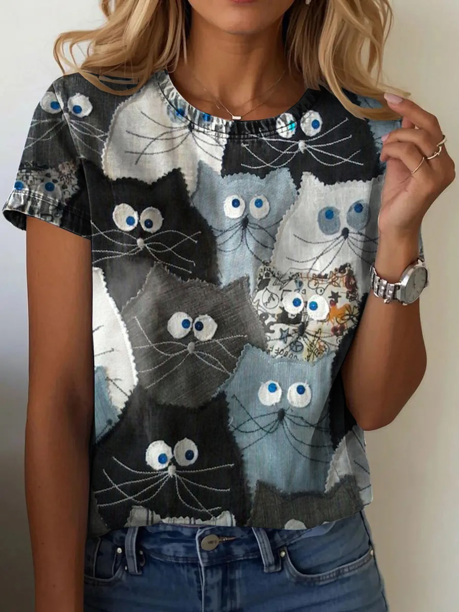 Women's Denim Art Cat Print Casual Short Sleeve T-Shirt