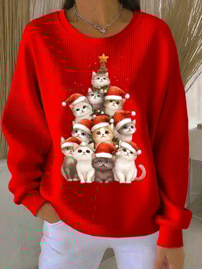 Women's Christmas Cat Print Knit Crew Neck Long Sleeve Top