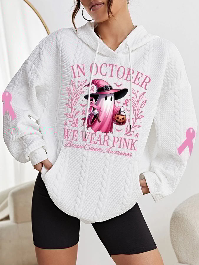 Women's In October We Wear Pink Halloween Ghost Breast Cancer Awareness Warrior Cable Hoodie