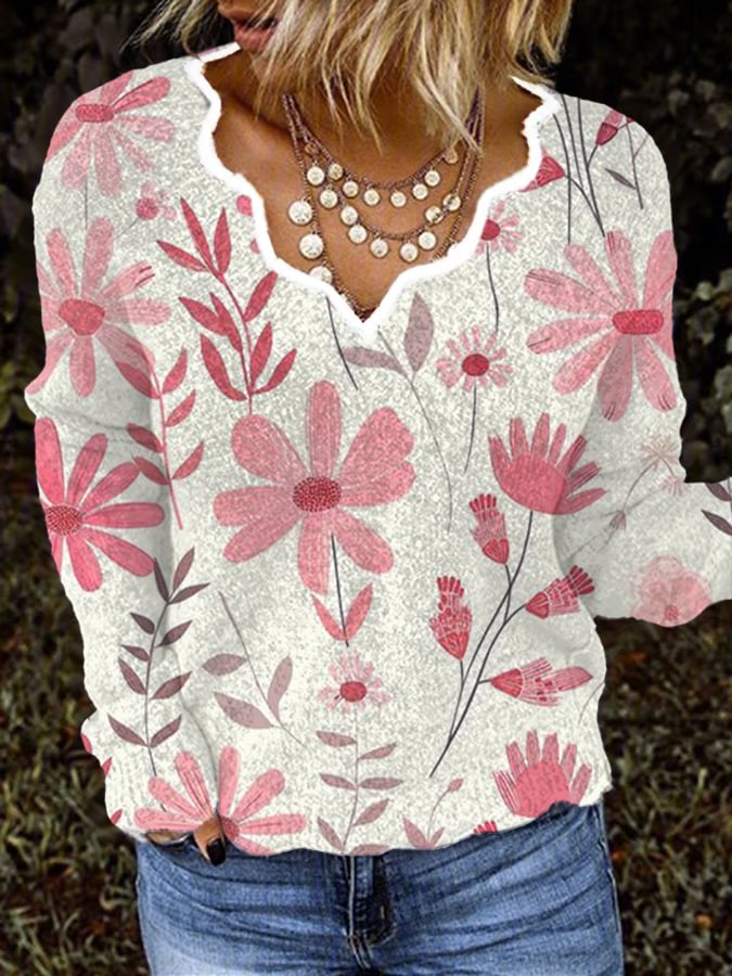 Women's Breast Cancer Flower Print Lace Collar Sweater