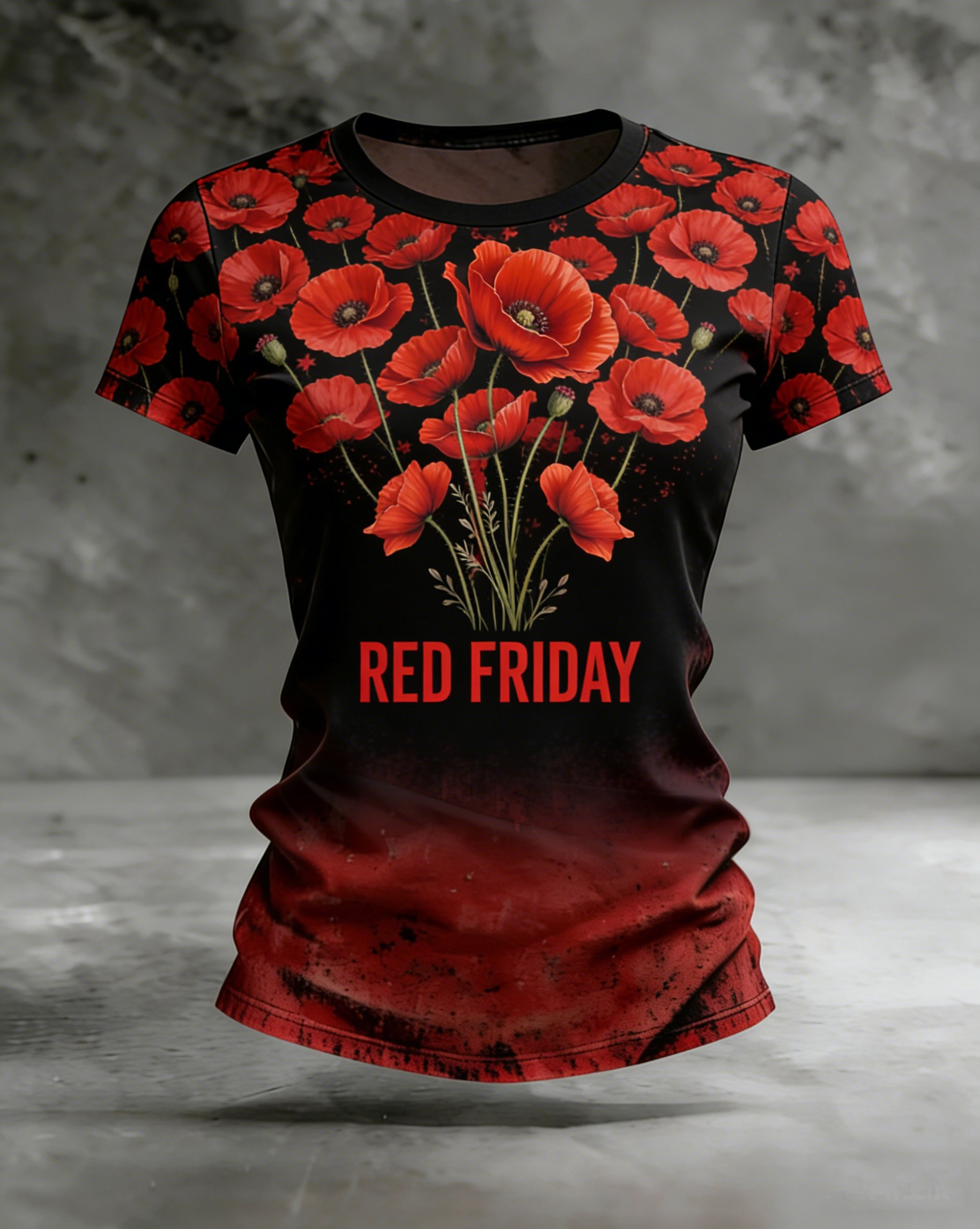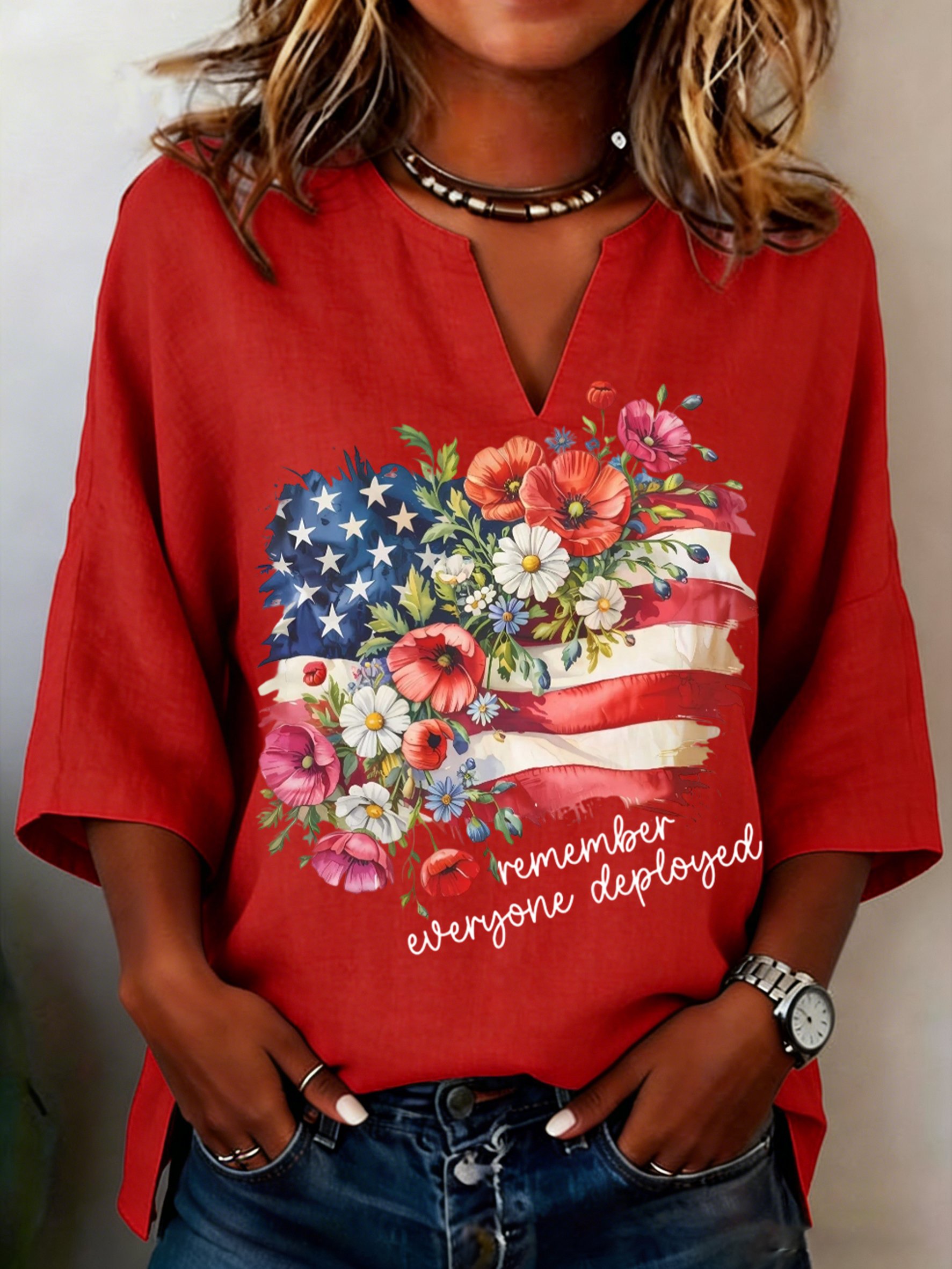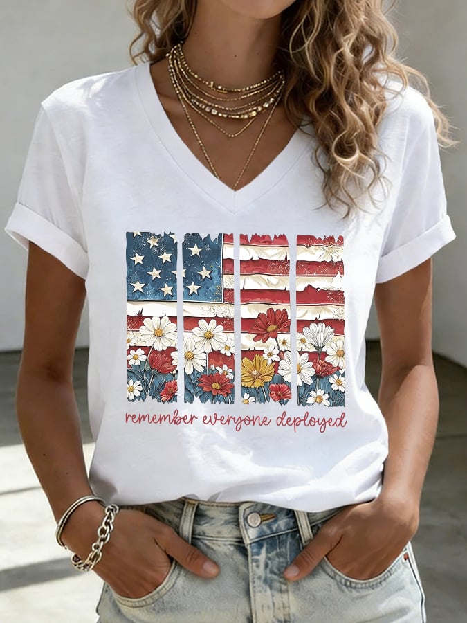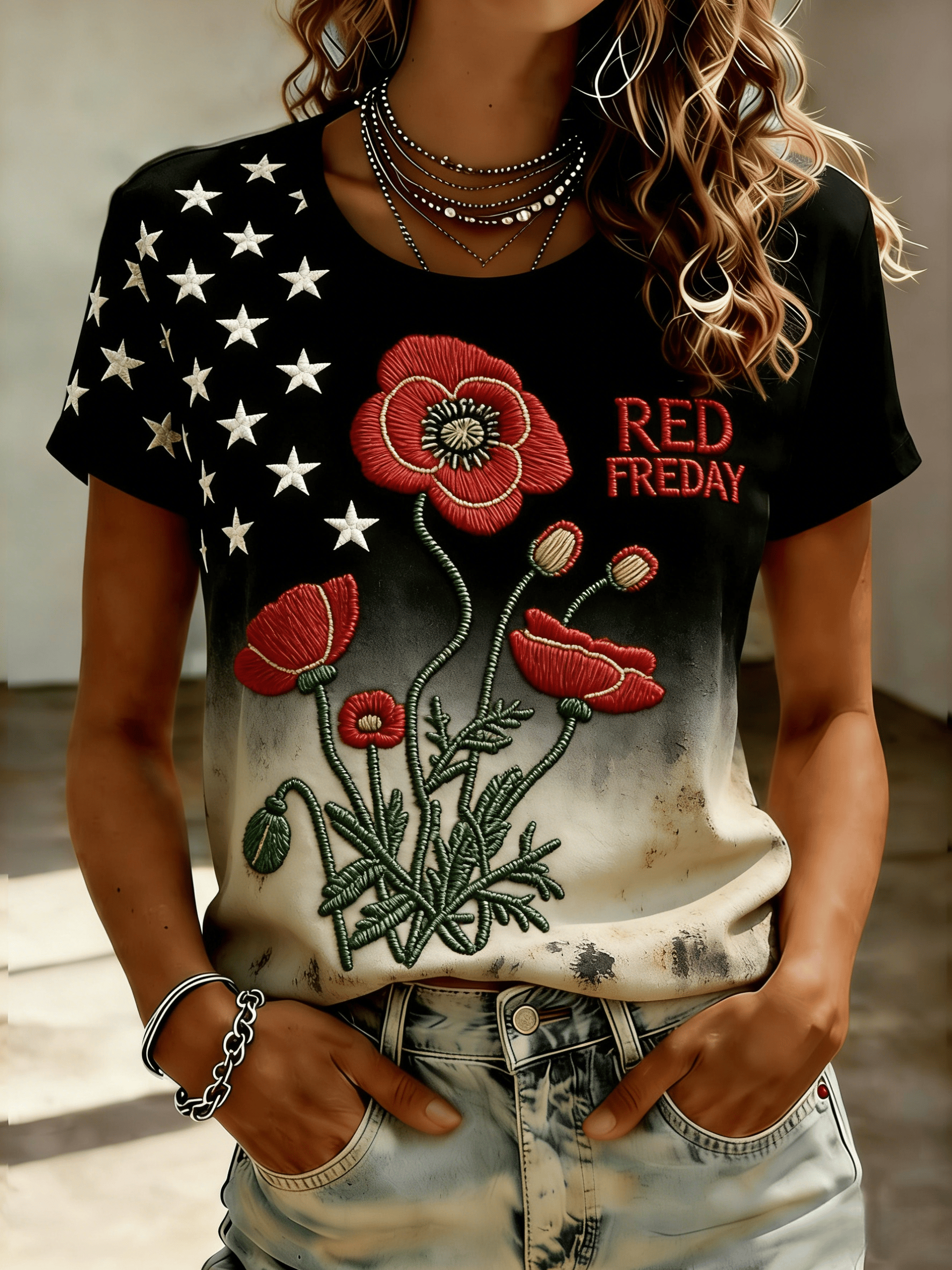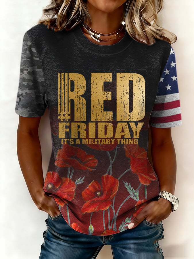 Women's Red Friday Poppy Print Casual Crew Neck Short Sleeve T-Shirt