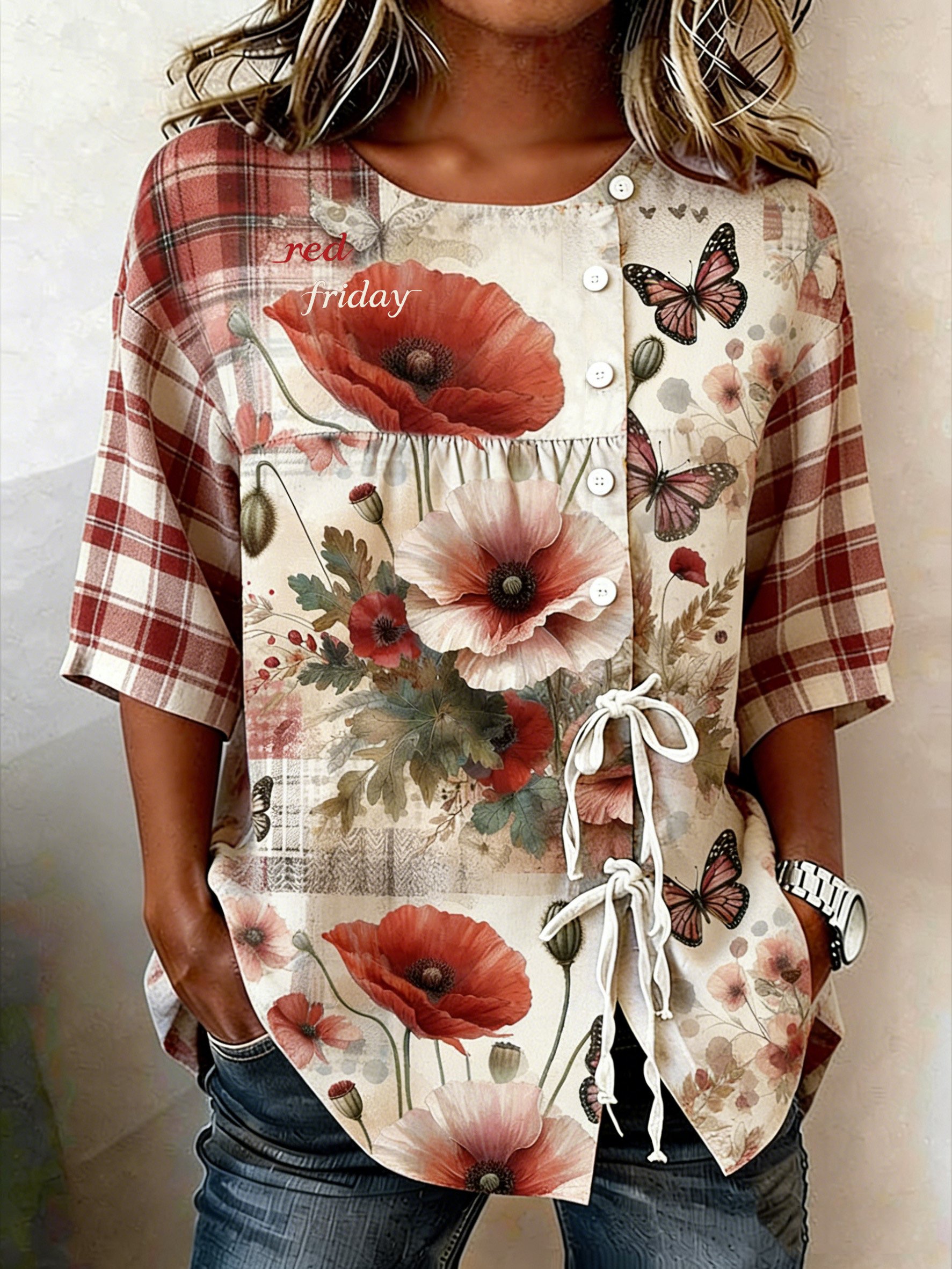 Women's Red Friday Floral Print Cotton-Linen Top