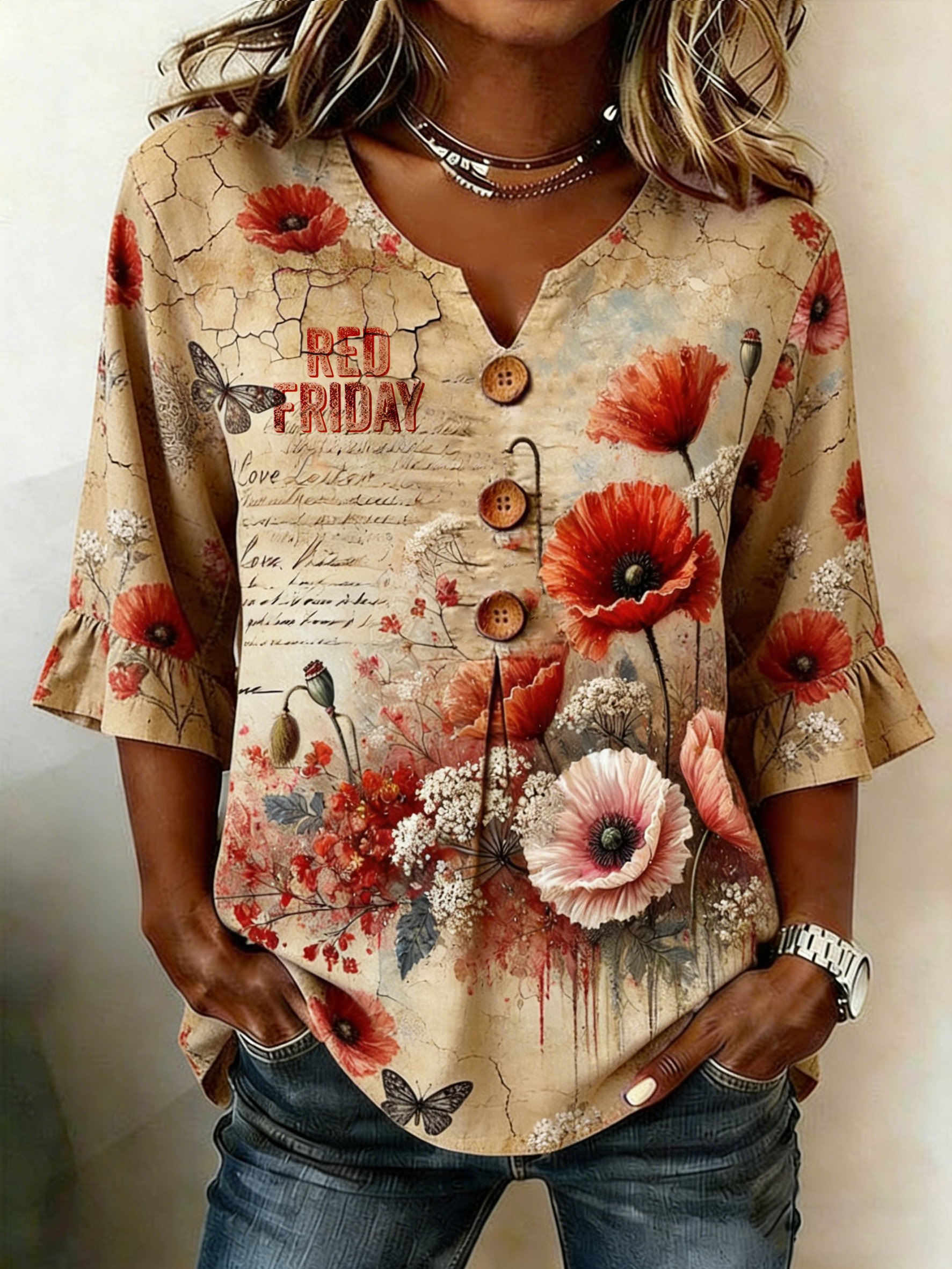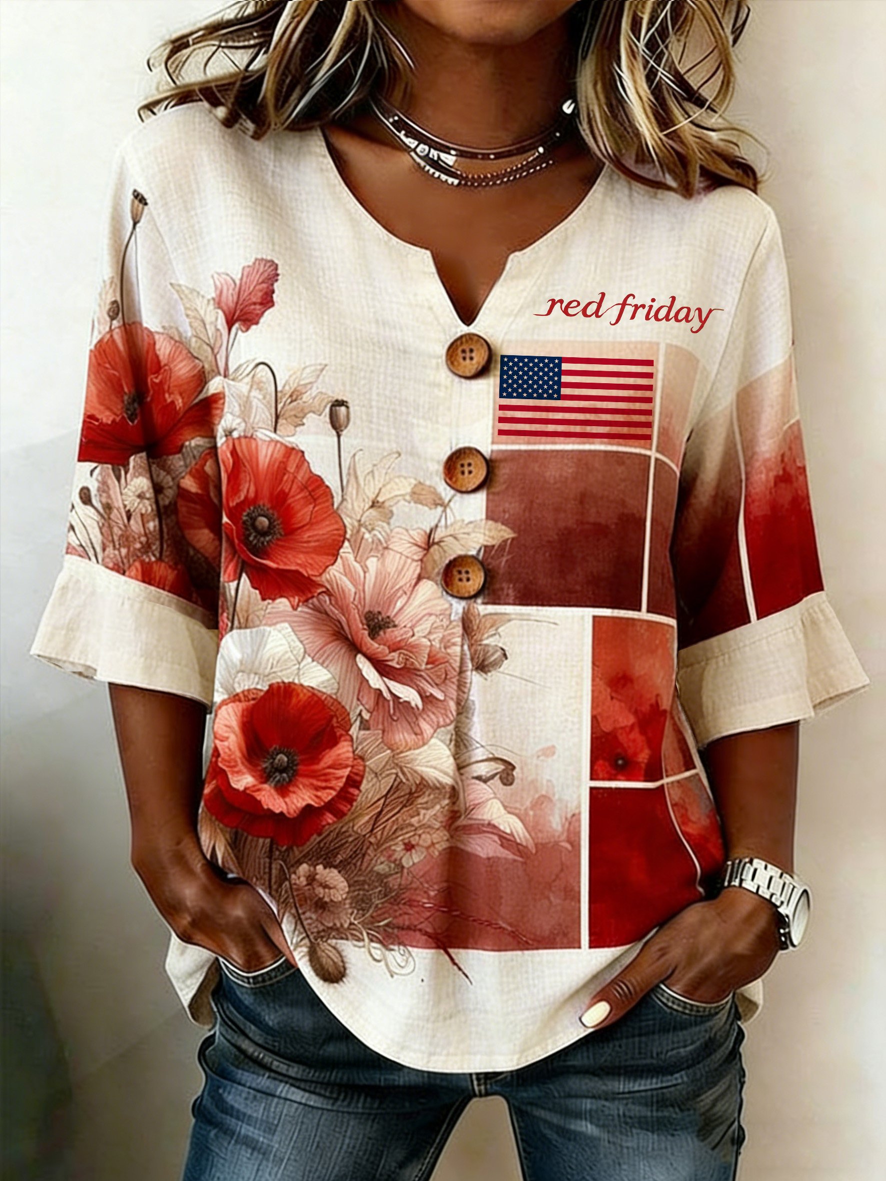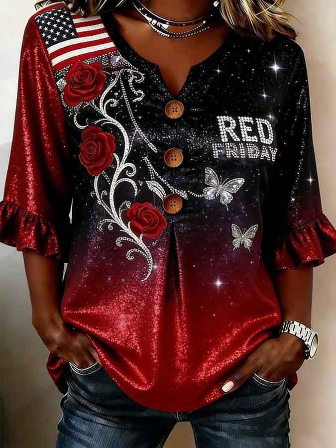 Women's Vintage Red Friday Printed Casual Top