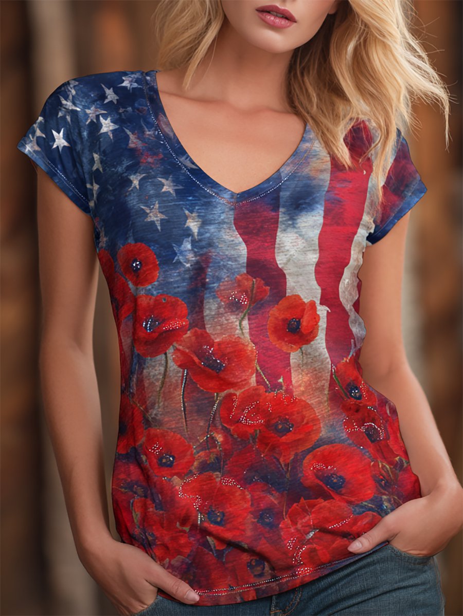 Women's Red Friday Casual Patriotic V-neck T-shirt