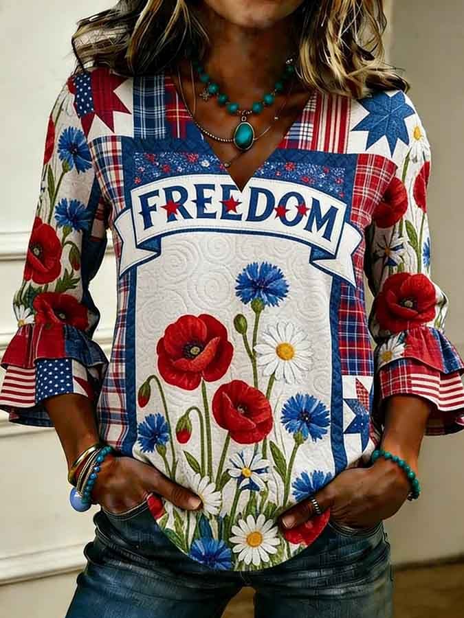 Women's Vintage Memorial Day Print Cotton-Linen Casual Top