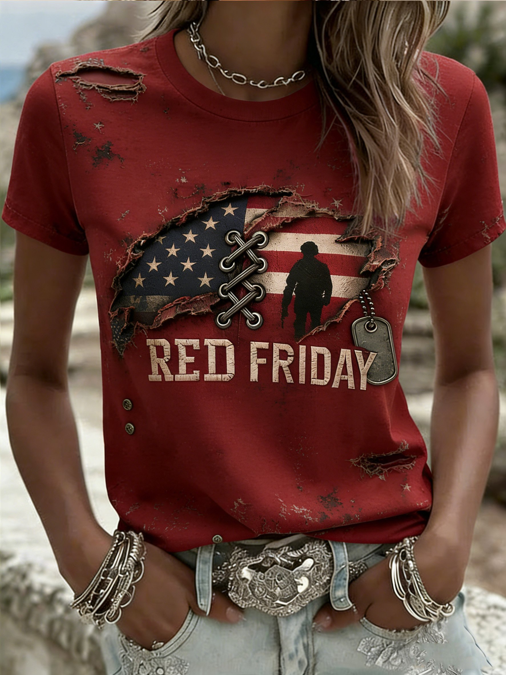 Women's Casual Red Friday Print Short-Sleeve T-Shirt